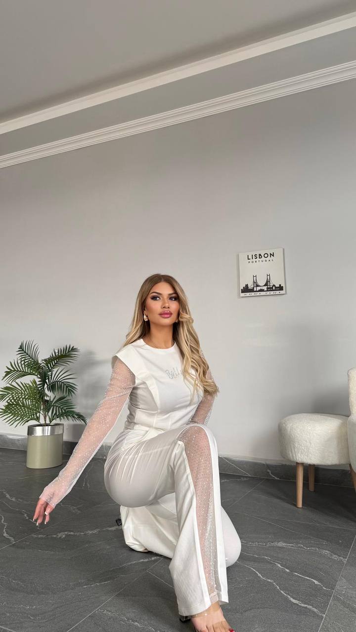 Bela komplet trenerka, gornji deo je dugih rukava sa sitnim cirkonima na rukavima a donji deo ima šire nogavice, za sve dame koje vole atraktivan izgled.