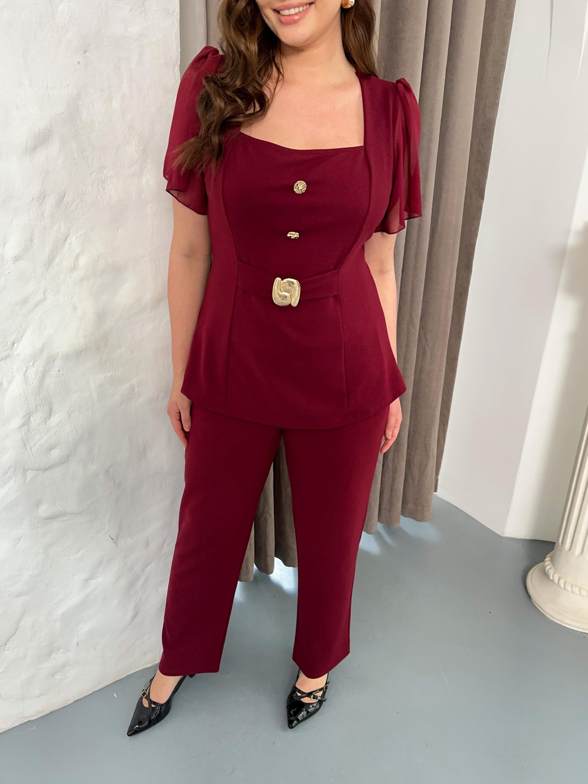 Komplet tunika i pantalone u bordo boji, tunika ima ukrasnu šnalu u struku boje zlata i kratkih je rukava, pantalone su klasicneg ravnog kroja lastiš u struku, komplet koji će učiniti vaš izgled sofisticiranim i elegantnim.