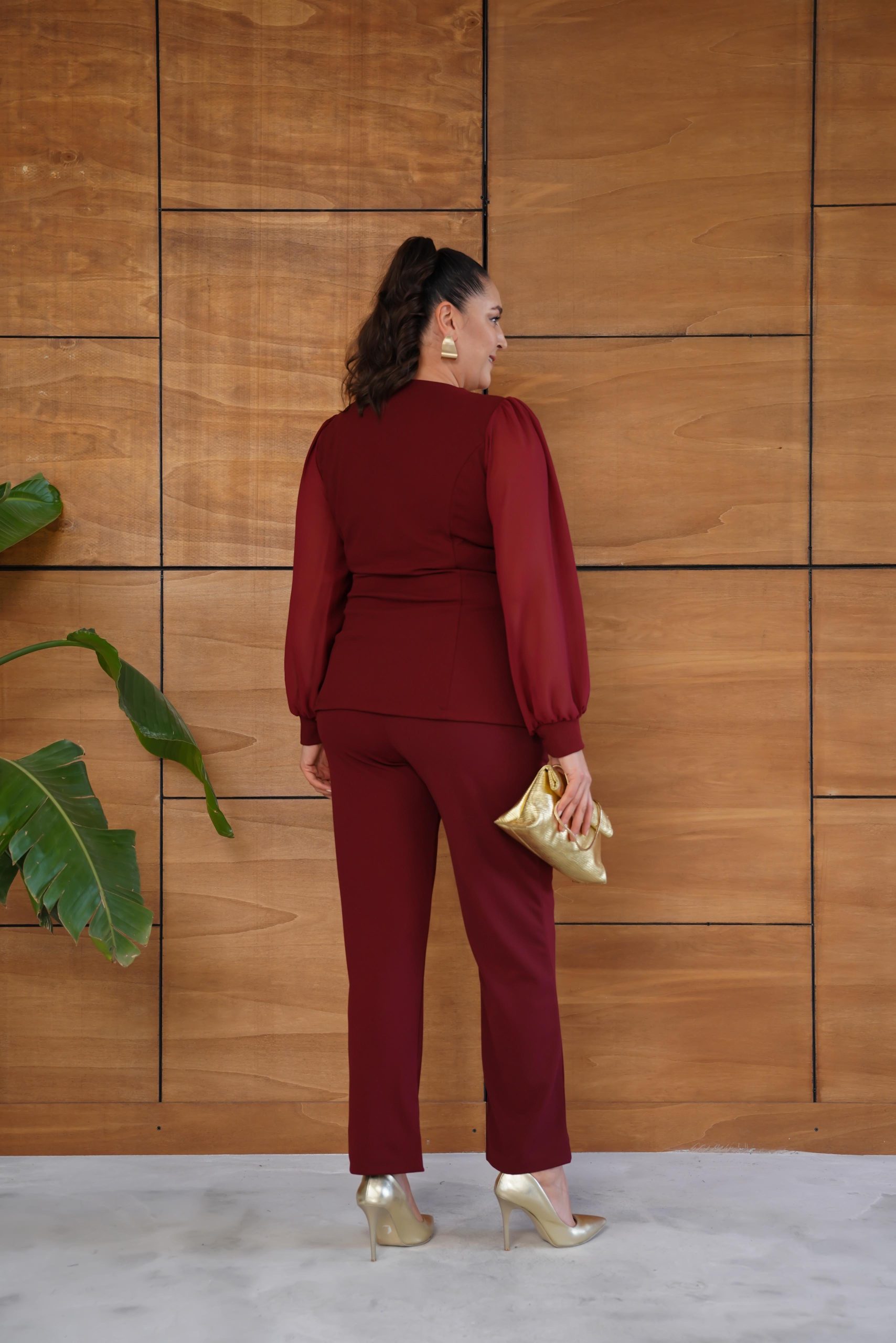 Bordo svečani komplet tunika i pantalone, tunika ima ukrasnu dugmad boje zlata i providne rukave od tila, pantalone su klasicnog ravnog kroja lastiš u struku, odličan izbor za sve vaše posebne prilike.
