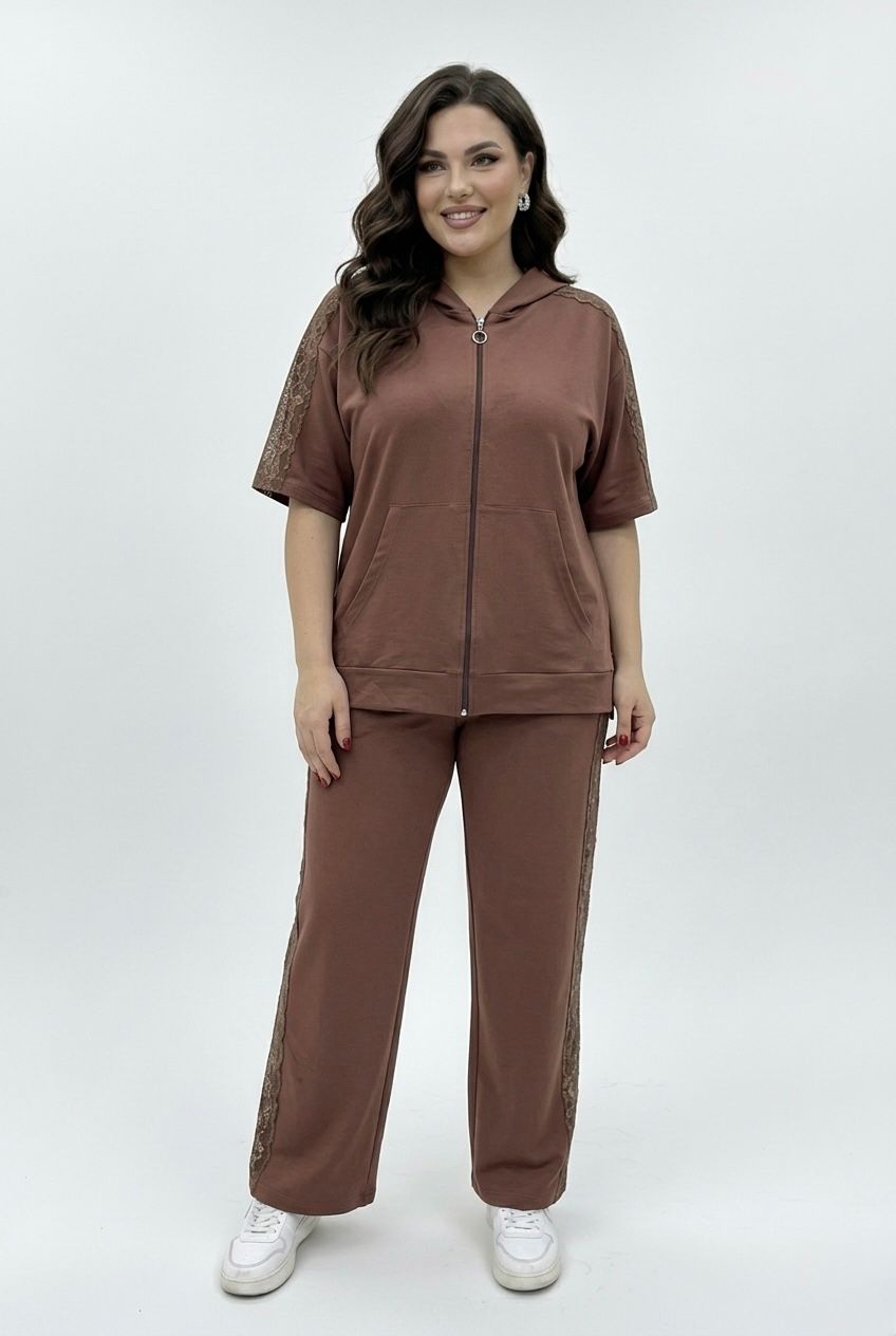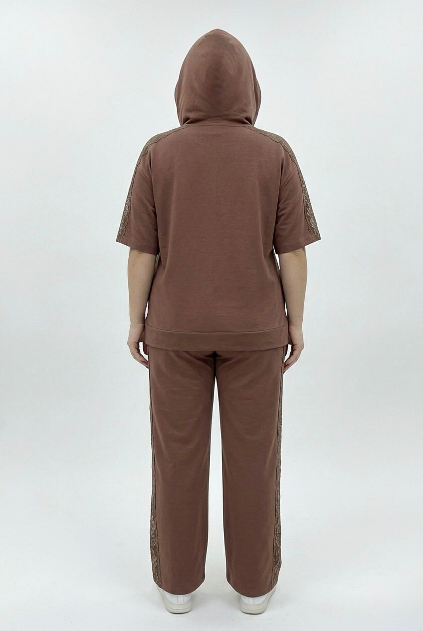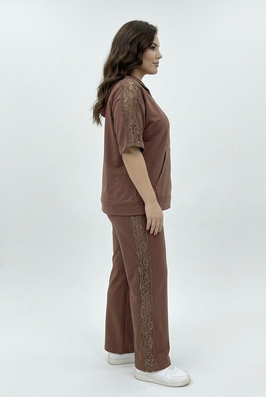 Braon komplet trenerka gornji deo je na raskopčavanje i kratkih je rukava a donji deo je sa ravnim nogavicama, ima čipkani rad na gornjem i donjem delu, odličan model za sve one koje vole udobnost i ležeran stil.