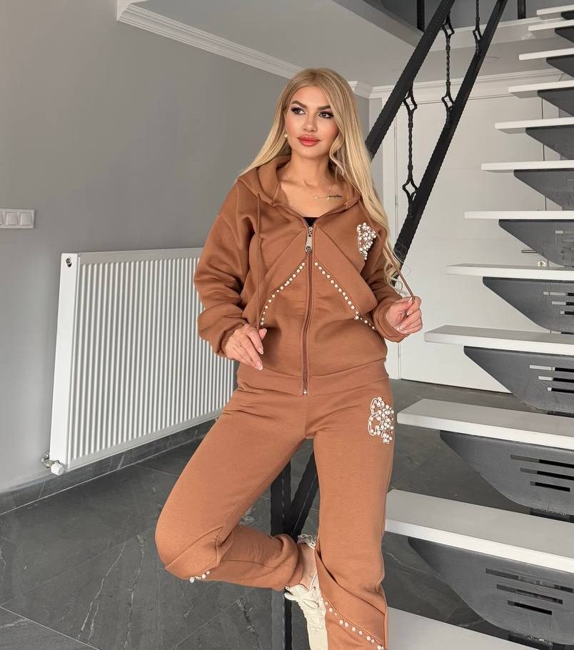 Braon komplet trenerka sa detaljima u vidu bisera, gornji deo je na raskopcavanje, topla i udobna trenerka za sve dame koje vole sportski stil.