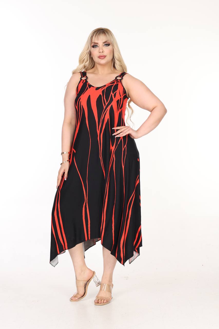 Crna asimetrična haljina sa efektnim crvenim šarama na bretele, kroja koji se blago širi na dole, lagana i prijatna za nošenje.