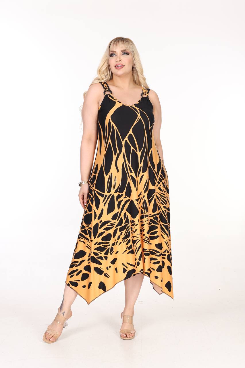 Crna asimetrična haljina sa efektnim žutim šarama na bretele, kroja koji se blago širi na dole, lagana i prijatna za nošenje.