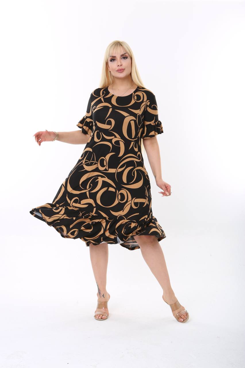 Crna haljina kratkih rukava sa braon šarama, sa efektnim karnerom u donjem delu haljine, idealna za letnje dane.