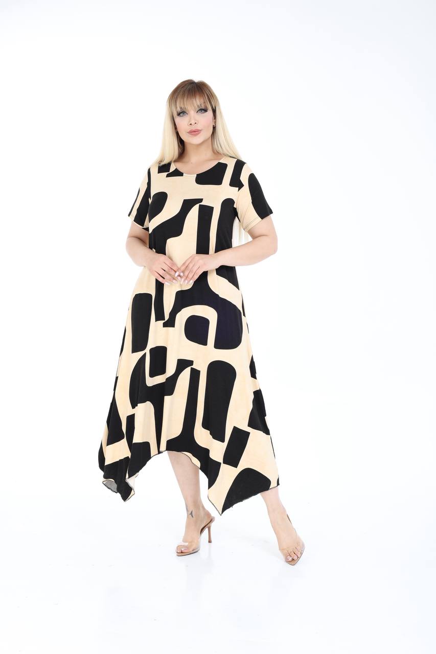 Crna asimetrična haljina sa efektnim šarama kratkih rukava, kroja koji se blago širi na dole, model koji će izdužiti vašu figuru.