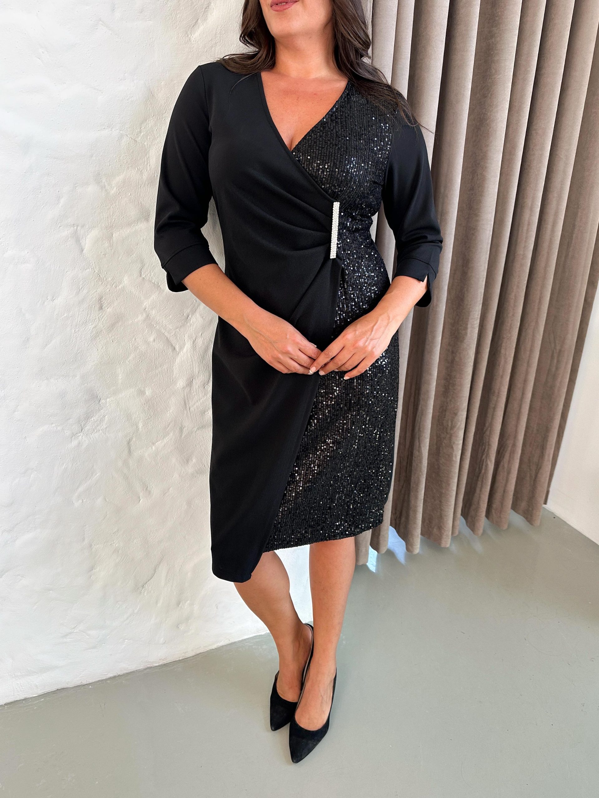 Crna haljina sa detaljima u vidu efektnih šljokica, kroj prati liniju tela, učiniće vaš izgled elegantnim idealan izbor za vaše posebne prilike.