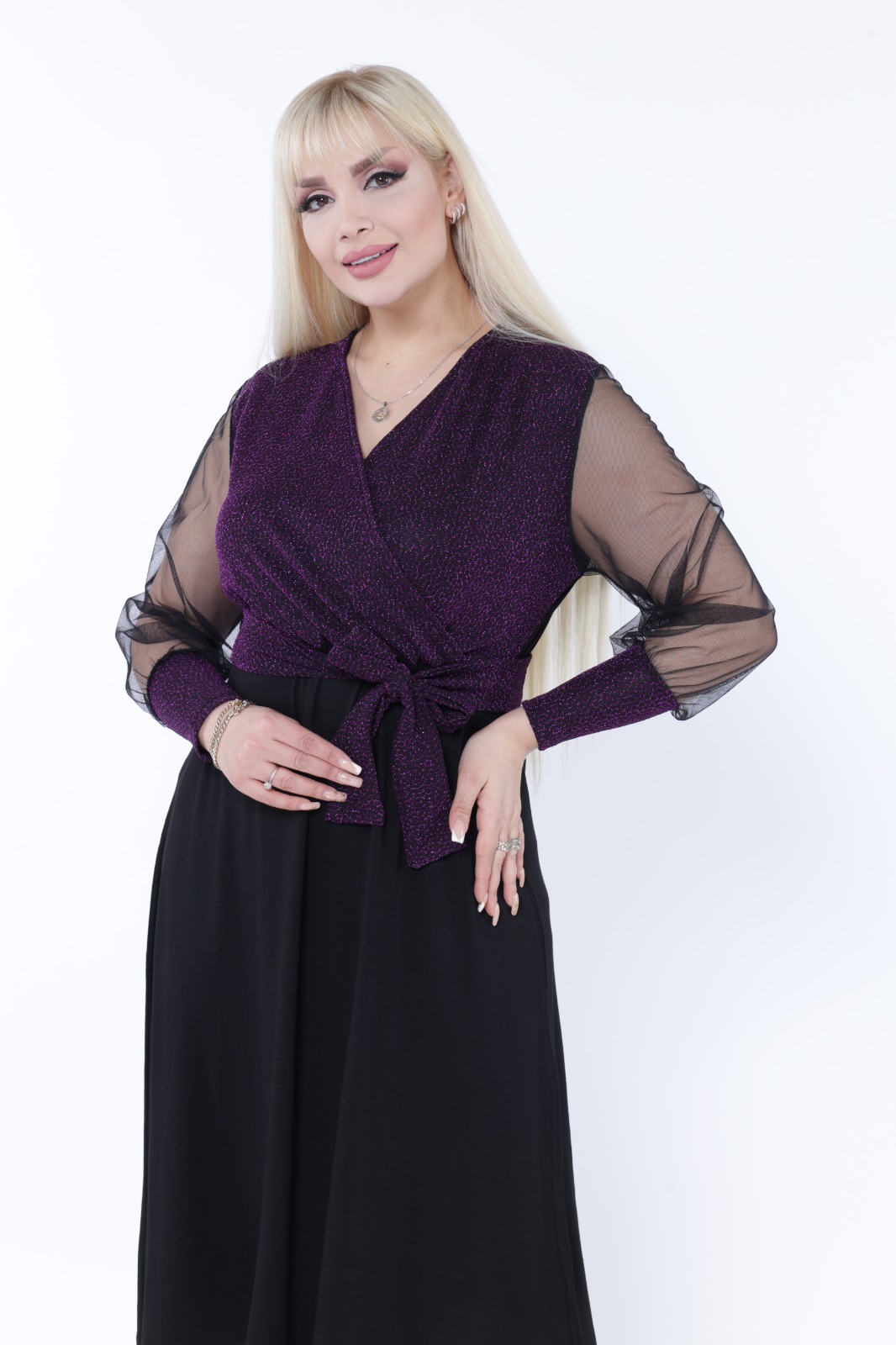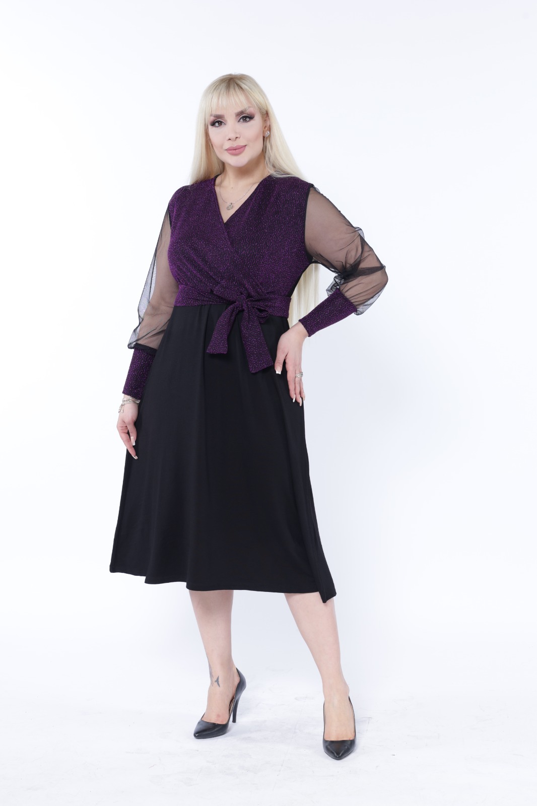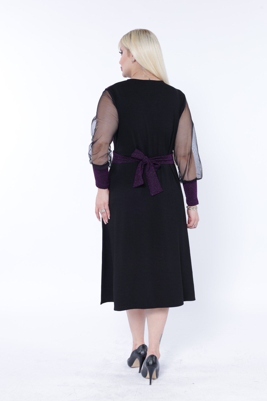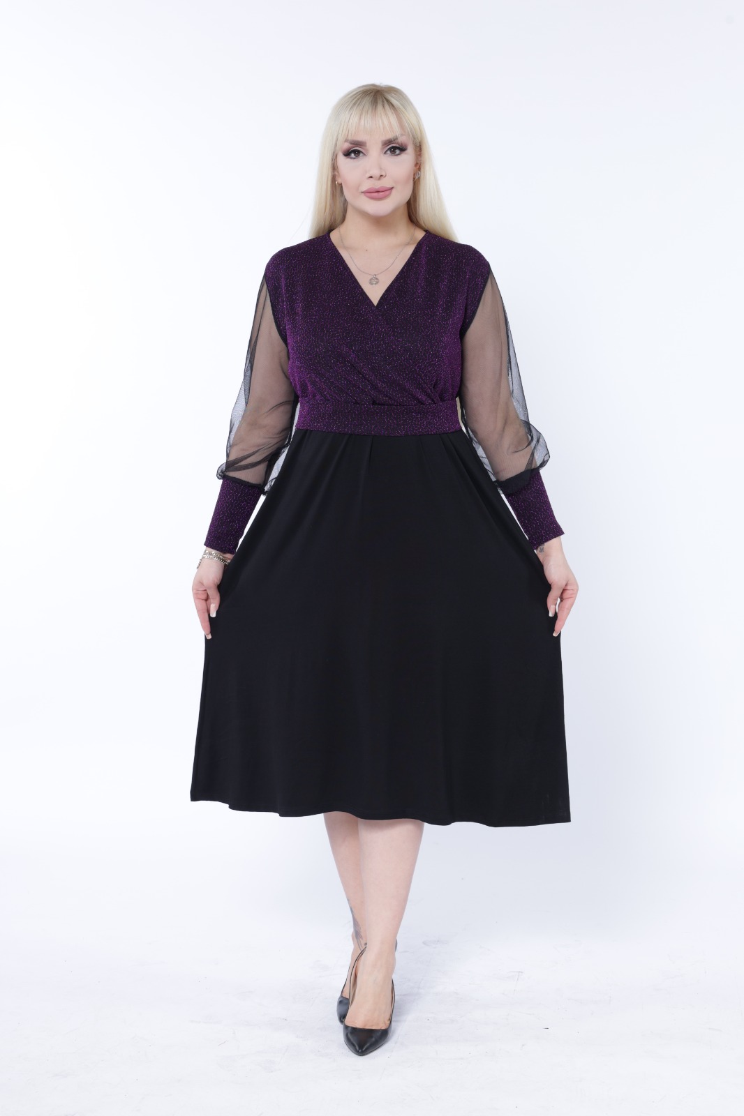 Crna haljina sa providnim rukavima od tila i gornjim delom u ljubičastoj boji, kroja koji se blago širi na dole, odlican izbor kako za poslovne tako i za svečanije prilike.