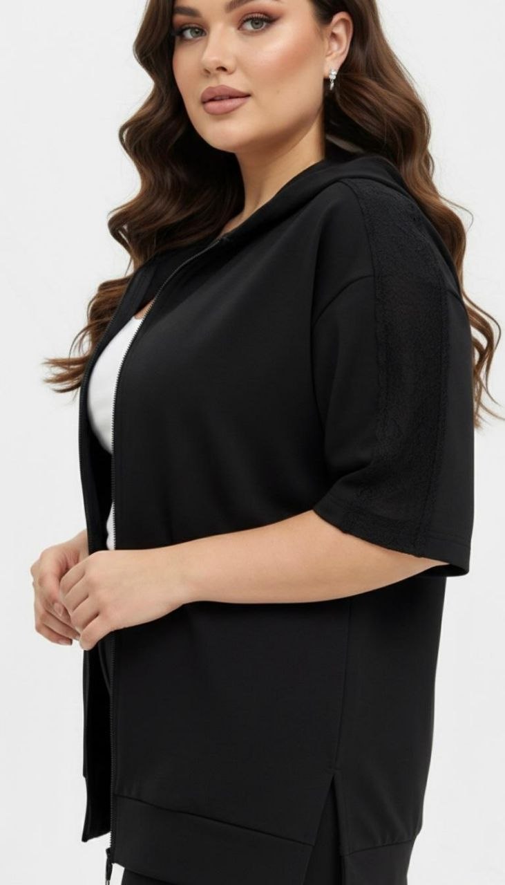 Crna komplet trenerka gornji deo je na raskopčavanje i kratkih je rukava a donji deo je sa ravnim nogavicama, ima čipkani rad na gornjem i donjem delu, odličan model za sve one koje vole udobnost i ležeran stil.