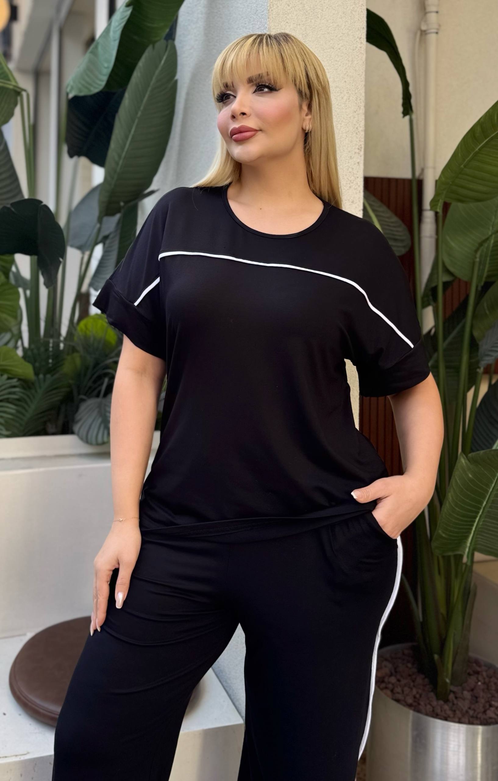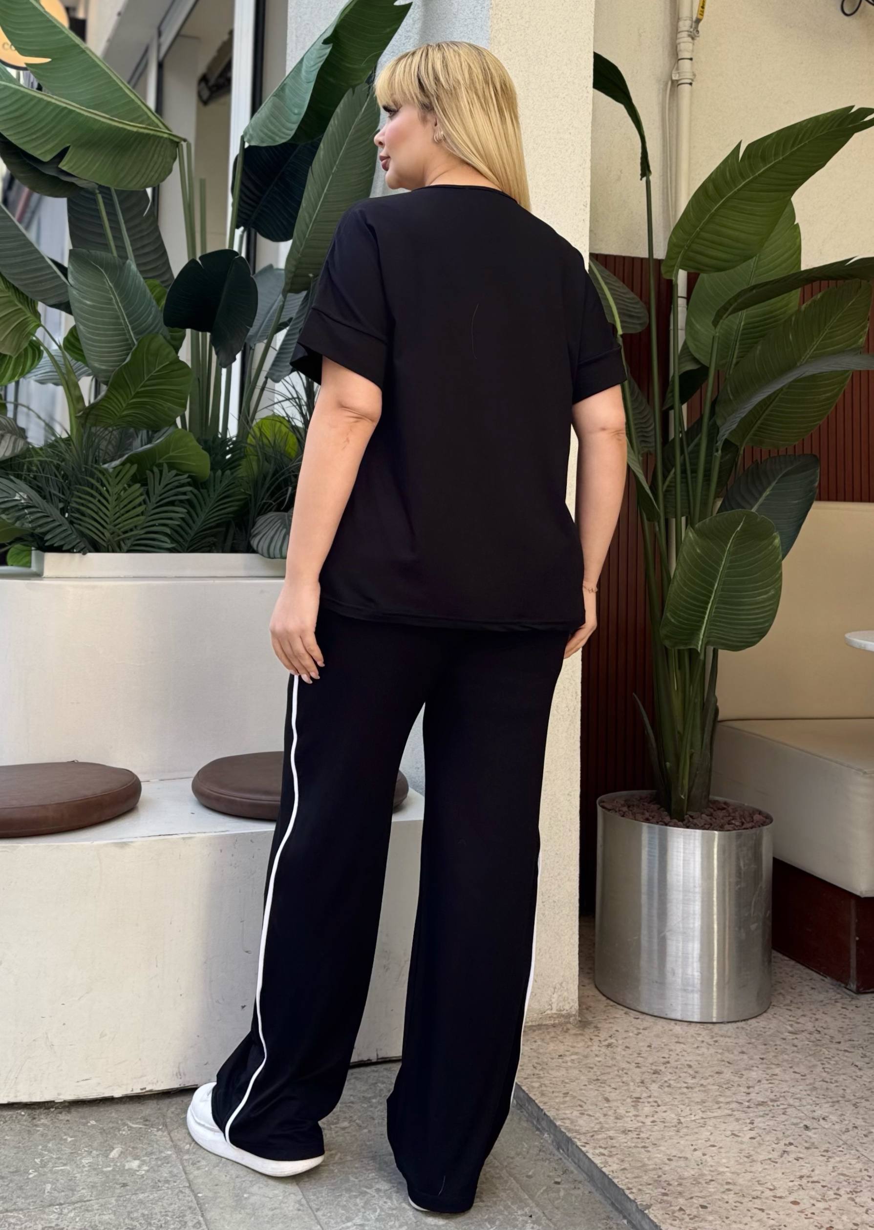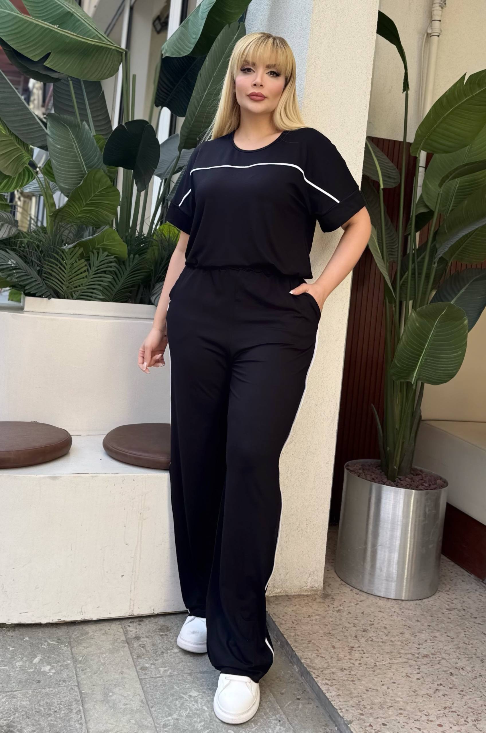 Komplet trenerka u crnoj boji sa belim linijama, odličan izbor za sve one koje vole udobnost i ležeran stil.