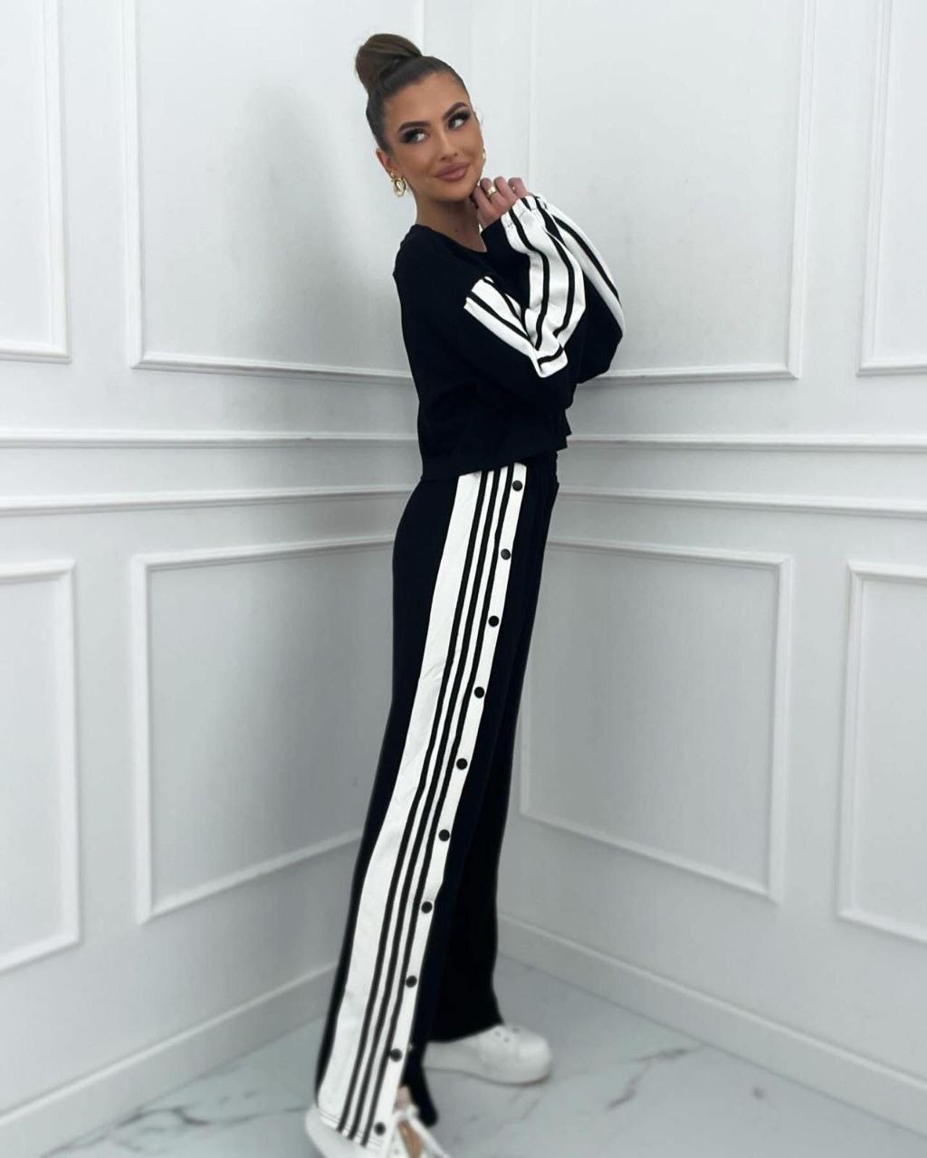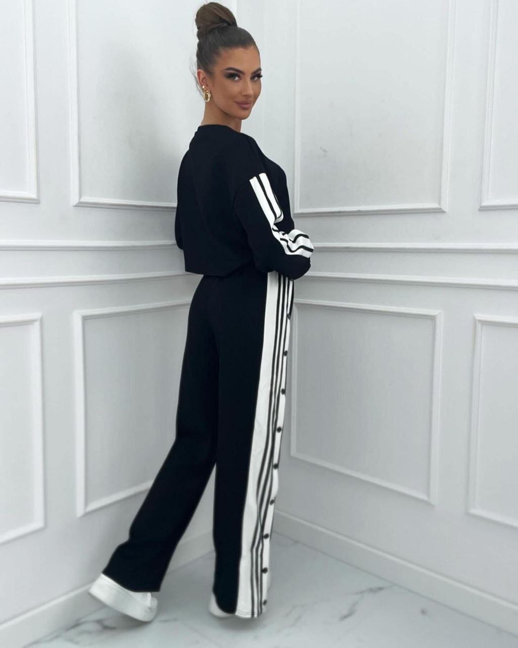 Crna trenerka sa belim detaljima, donji deo je širokog kroja sa dugmićima koji mogu da se otvaraju, odličan model za dame u trendu.