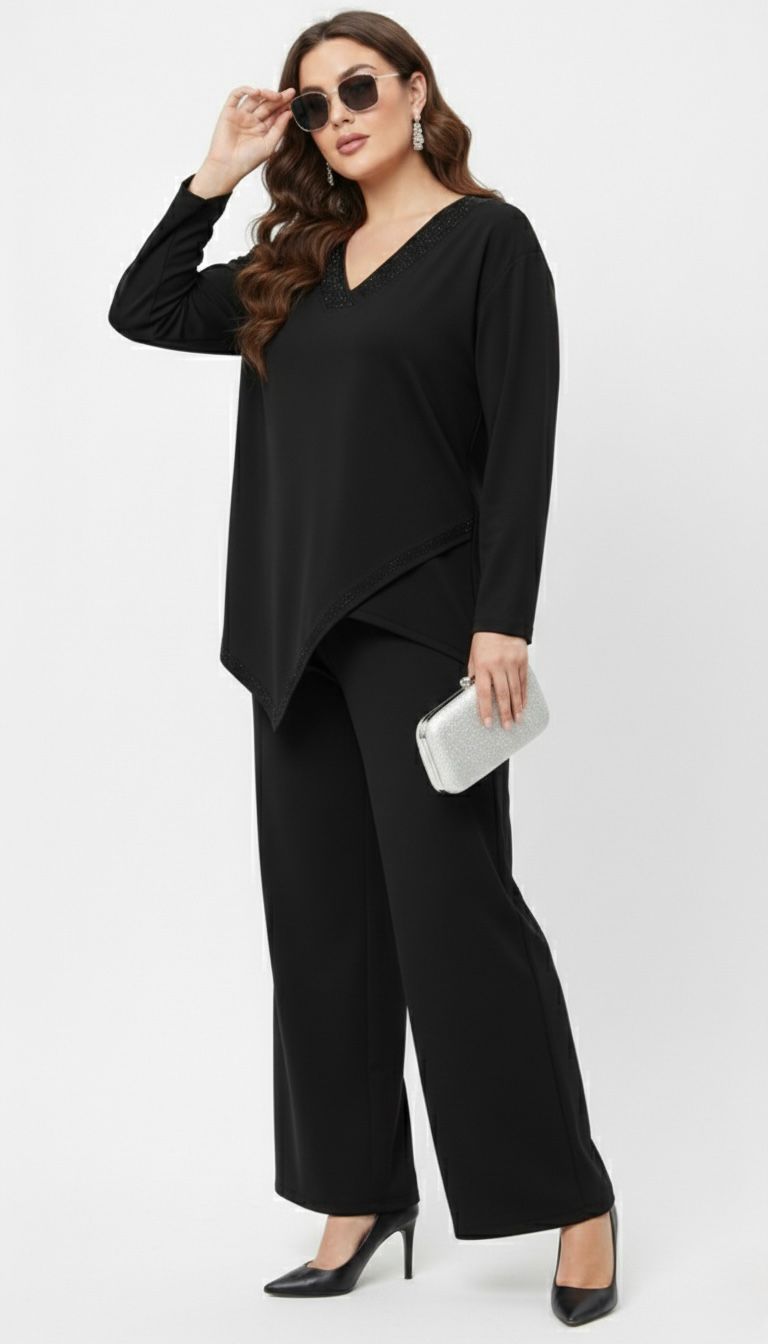 Crna komplet trenerka sa sitnim diskretnim cirkonima u gornjem delu na tunici, donji deo je sa ravnim nogavicama lastiš je u struku, odličan model za sve dame koje vole ležeran stil.