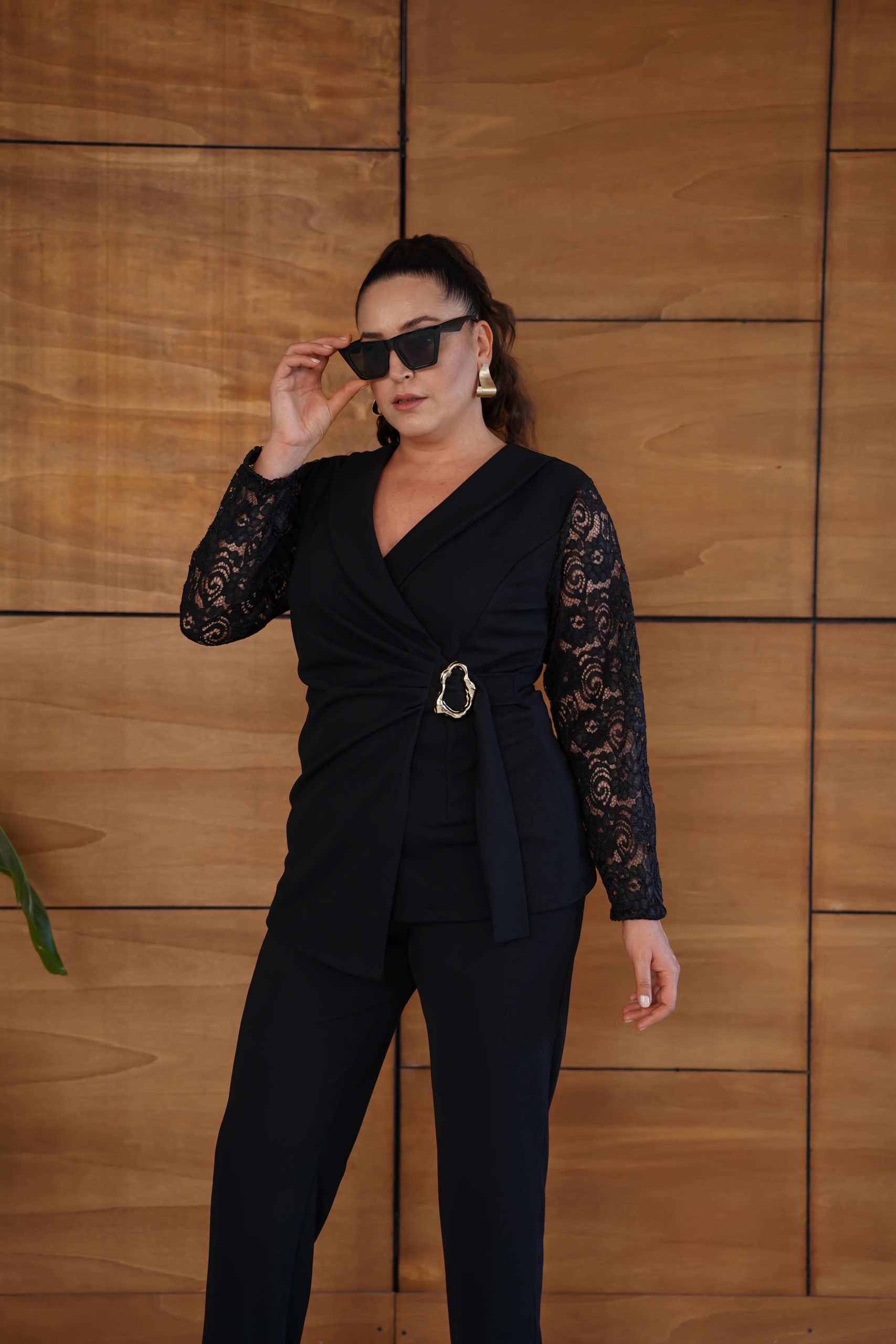 Crni komplet tunika i pantalone, tunika ima ukrasnu šnalu boje zlata u struku i čipkane rukave, pantalone su klasicnog ravnog kroja lastiš u struku, za sve dame koje vole elegantan izgled.