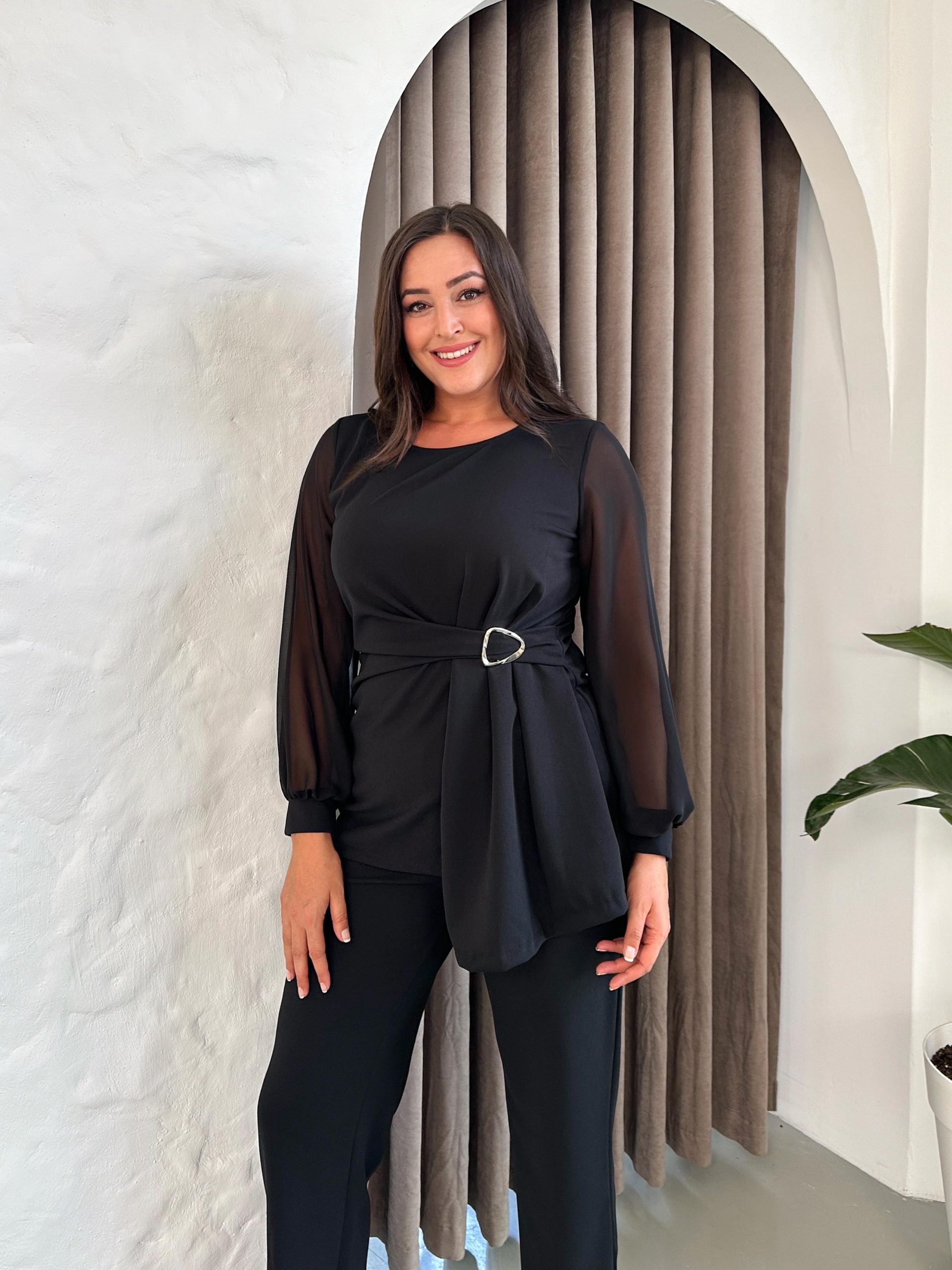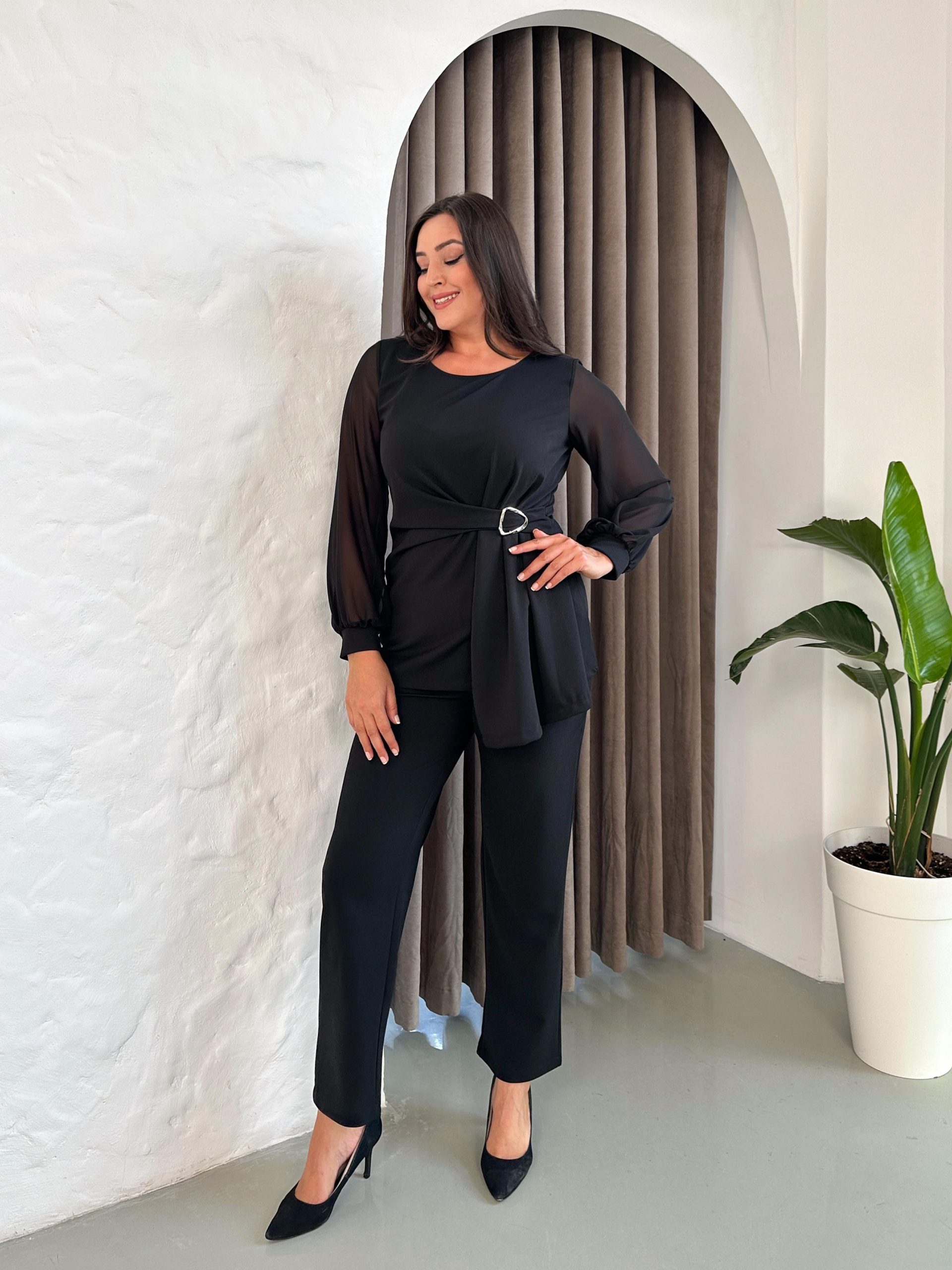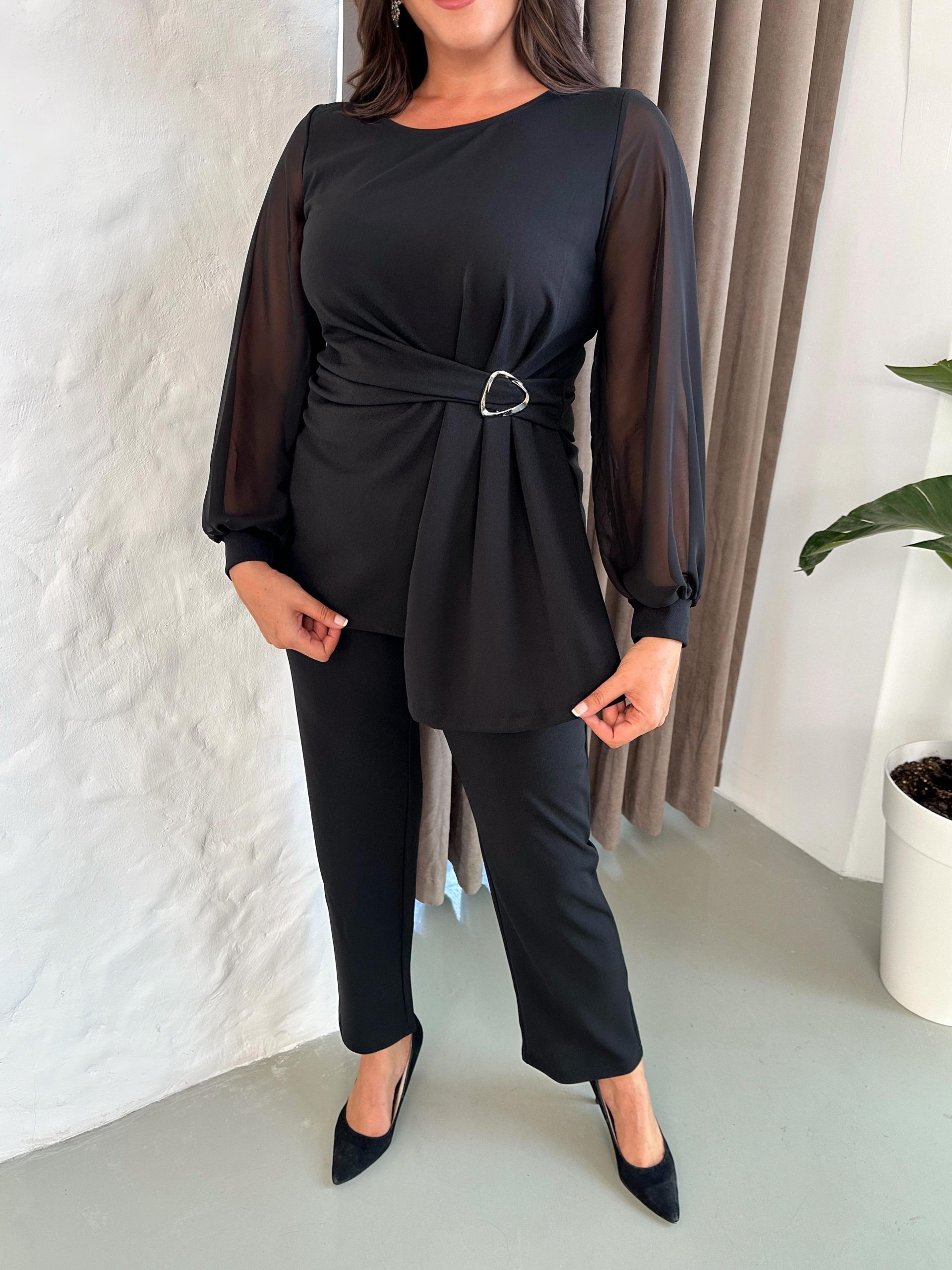 Komplet tunika i pantalone u crnoj boji, tunika ima rukave od tila i detalje u vidu ukrasne šnale u struku, pantalone su klasičnog ravnog kroja, za sve dame sa stilom.