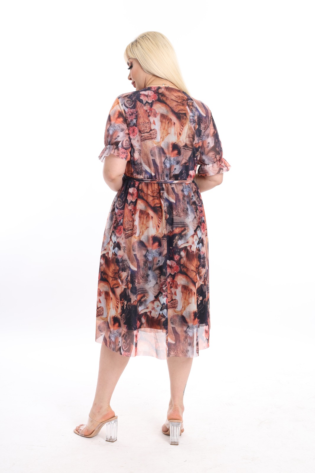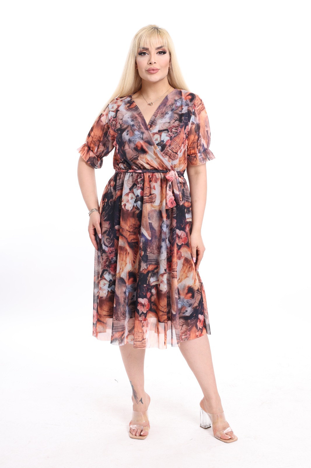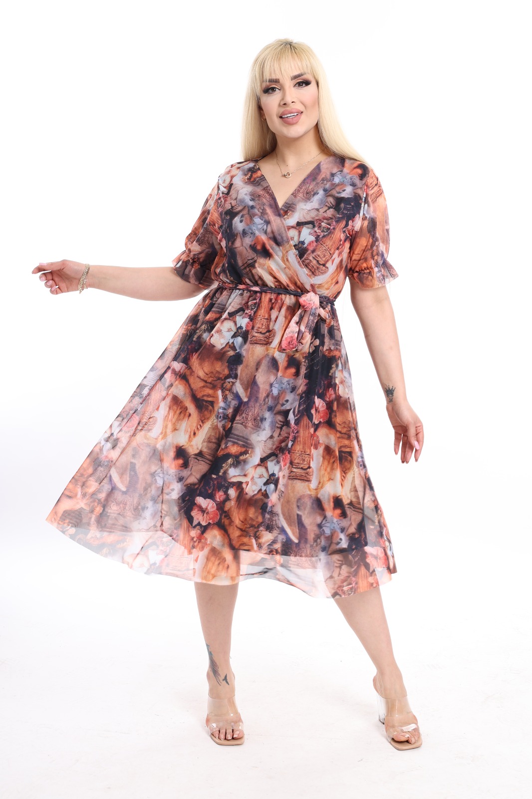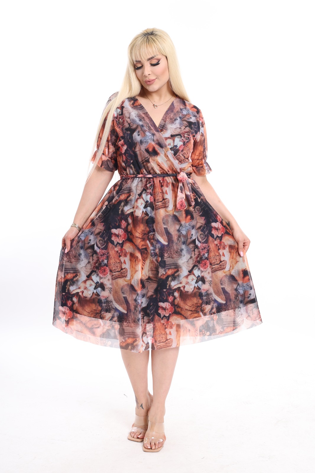 Haljina sa efektnim šarama do kolena, kroja koji se blago širi, lepršava idealna za tople dane.