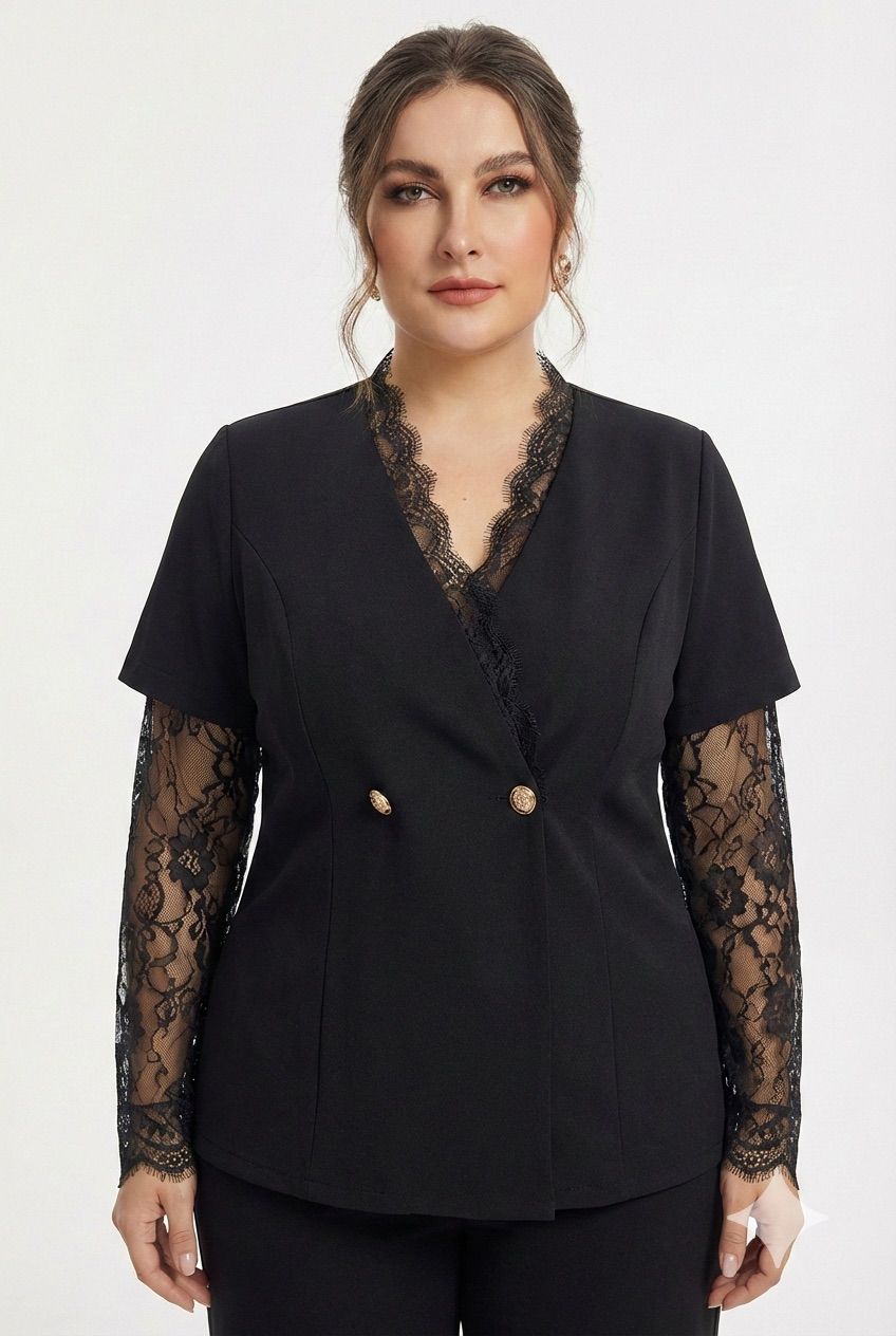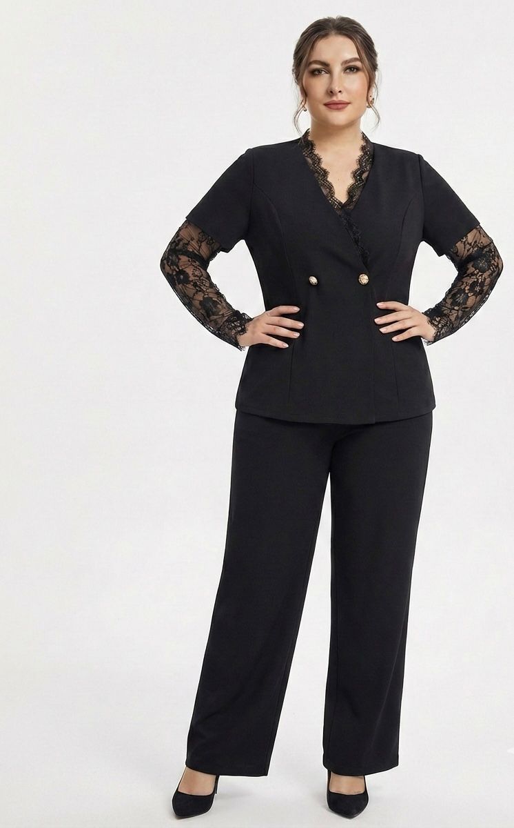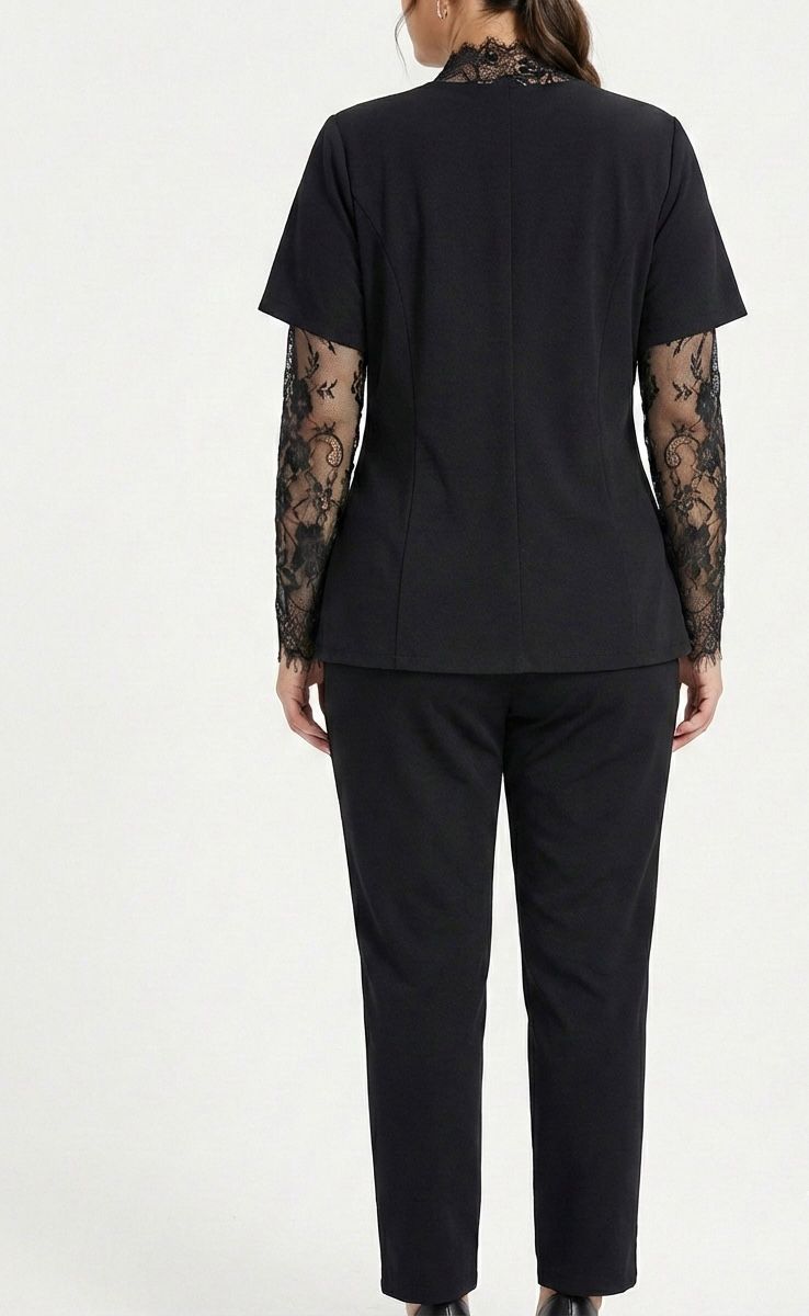 Komplet tunika i pantalone u crnoj boji, tunika ima čipkane rukave i detalje na tunici, pantalone su klasicneg ravnog kroja lastiš u struku, model idealan kako za poslovne tako i za svečane prilike.