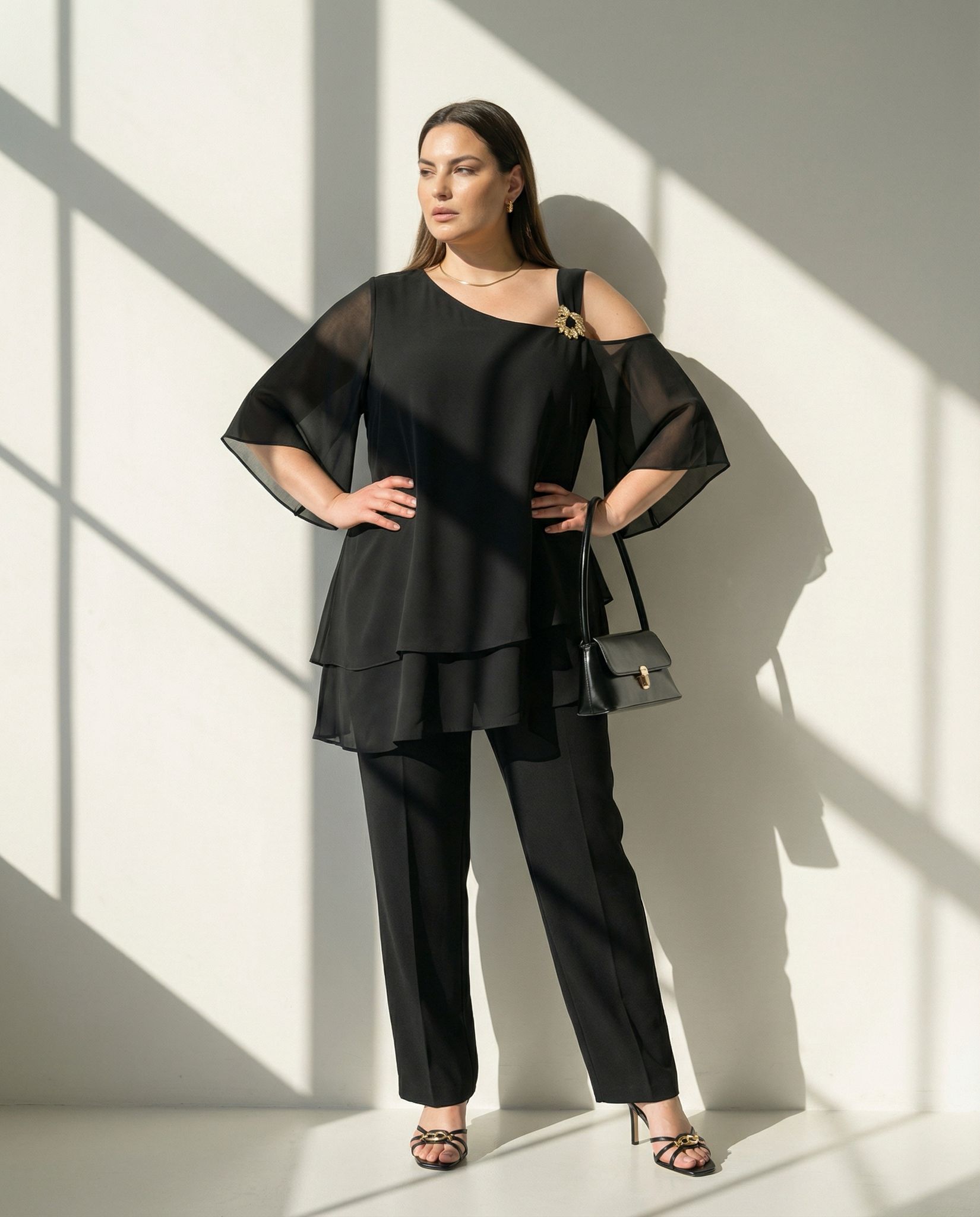 Komplet tunika i pantalone u crnoj boji, tunika ima efektnu ukrasnu šnalu na ramenu, pantalone su klasicnog ravnog kroja lastiš u struku, model koji će dati elegantnu notu vašem izgledu.