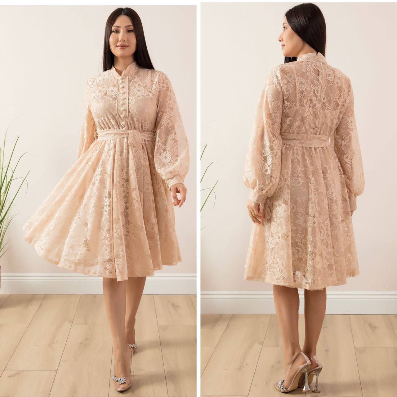 Krem haljina sa cipkom kroja koji se blago siri, sa kaisicem koja se vezuje oko struka, odlican izbor za sve prilike.