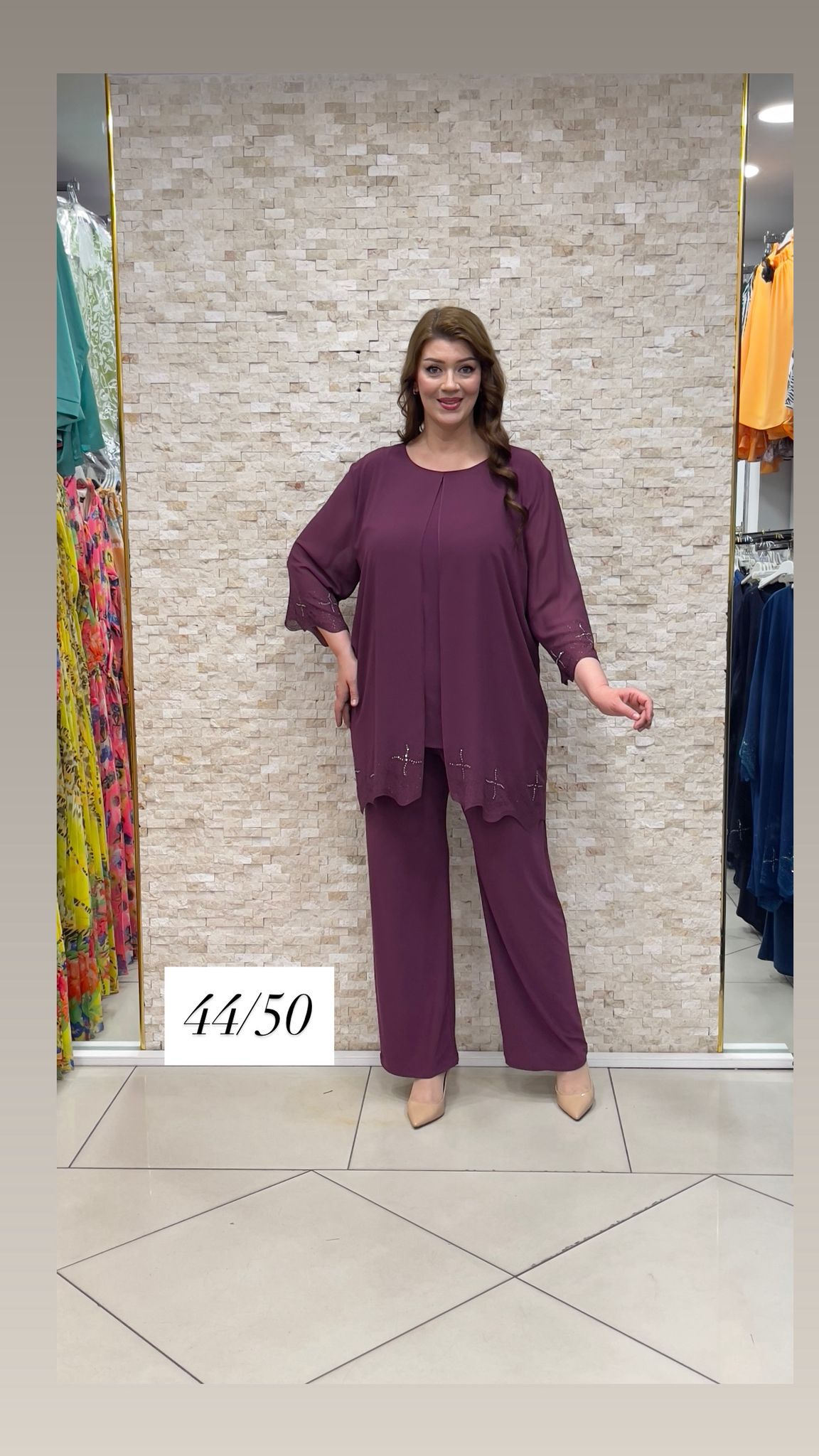 Svečani komplet u ljubičastoj boji, tunika ima diskretne ukrasne cirkone na rubu tunike, pantalone su klasičnog ravnog kroja lastiš je u struku, idealan model za sve vaše posebne prilike.