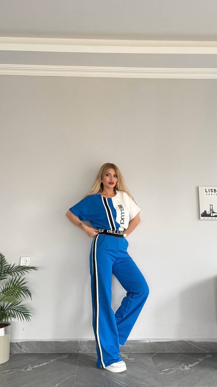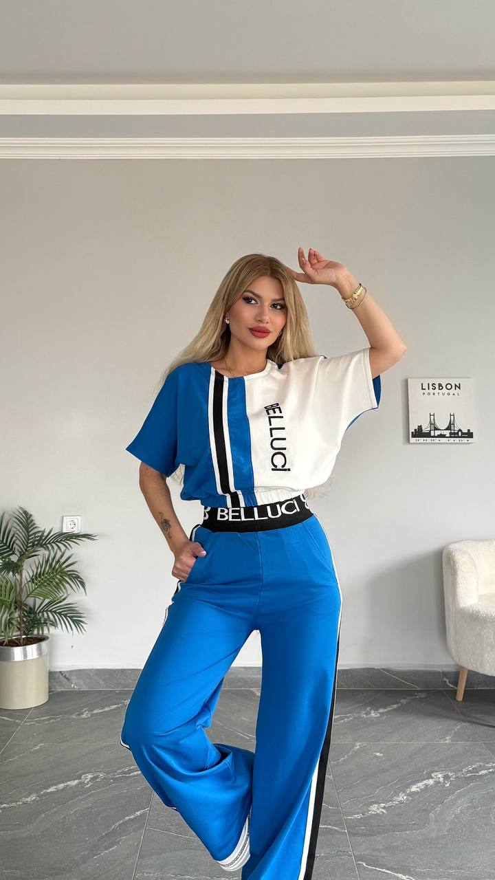 Plava trenerka sa crno belim detaljima, gornji deo je kraći kratkih rukava, za sve dame koje vole atraktivan izgled.