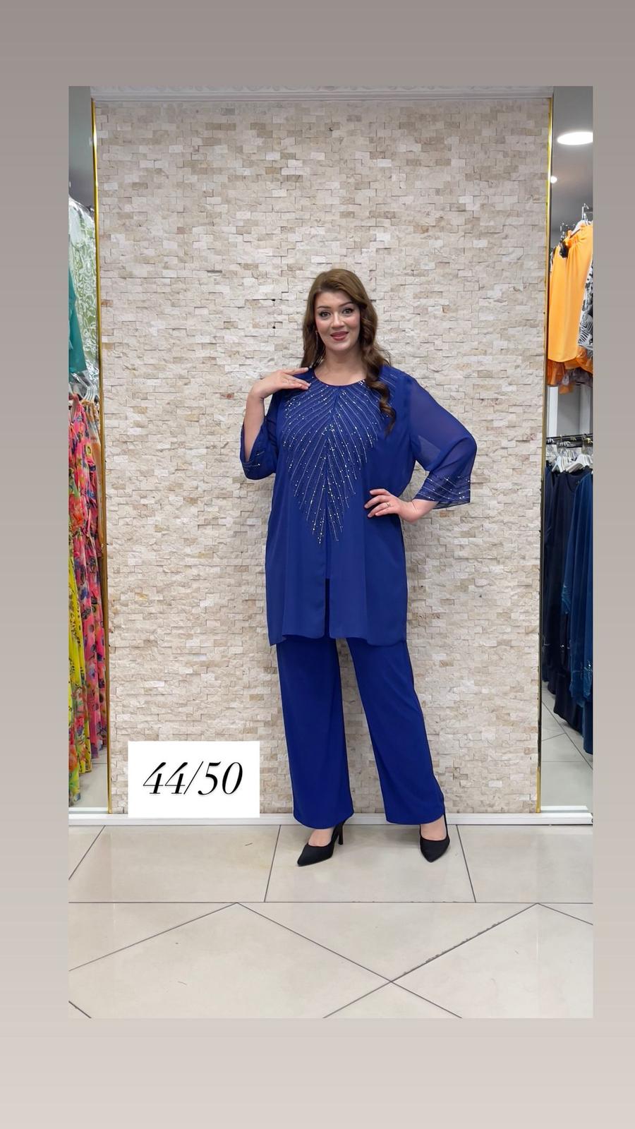 Svečani komplet u kraljevsko plavoj boji, tunika ima ukrasne cirkone, pantalone su klasičnog ravnog kroja lastiš je u struku, komplet idealan za sve vaše posebne prilike.