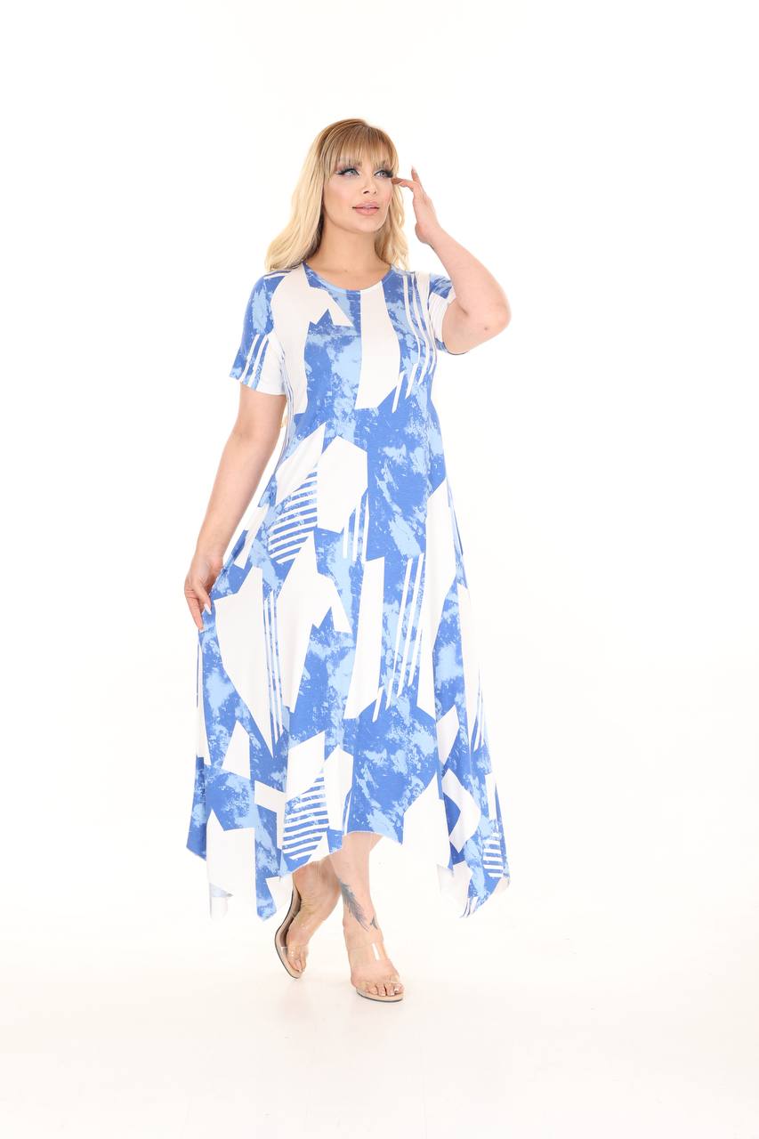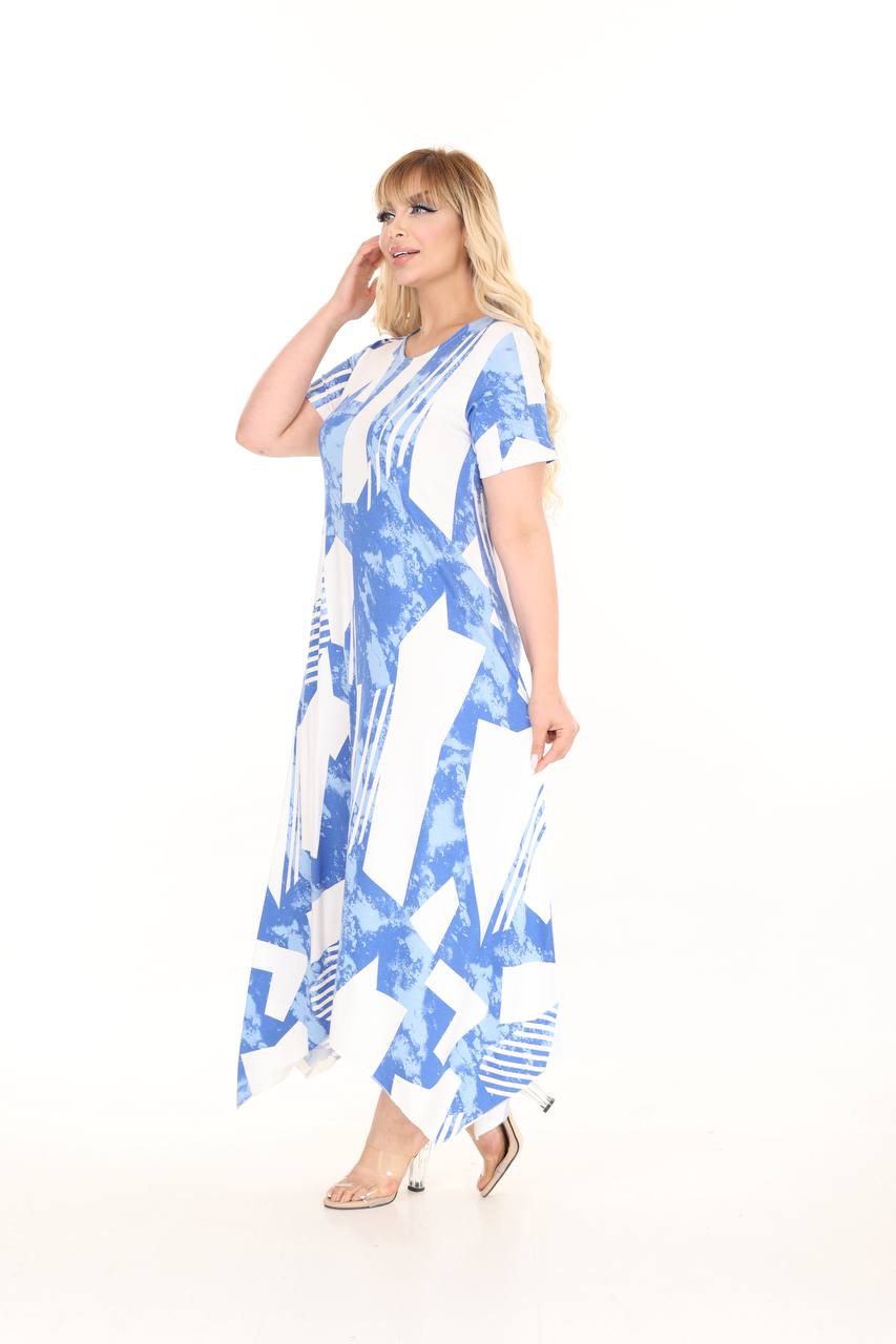 Pava asimetrična haljina sa belim šarama kratkih rukava, kroja koji se blago širi na dole, model koji će izdužiti vašu figuru.
