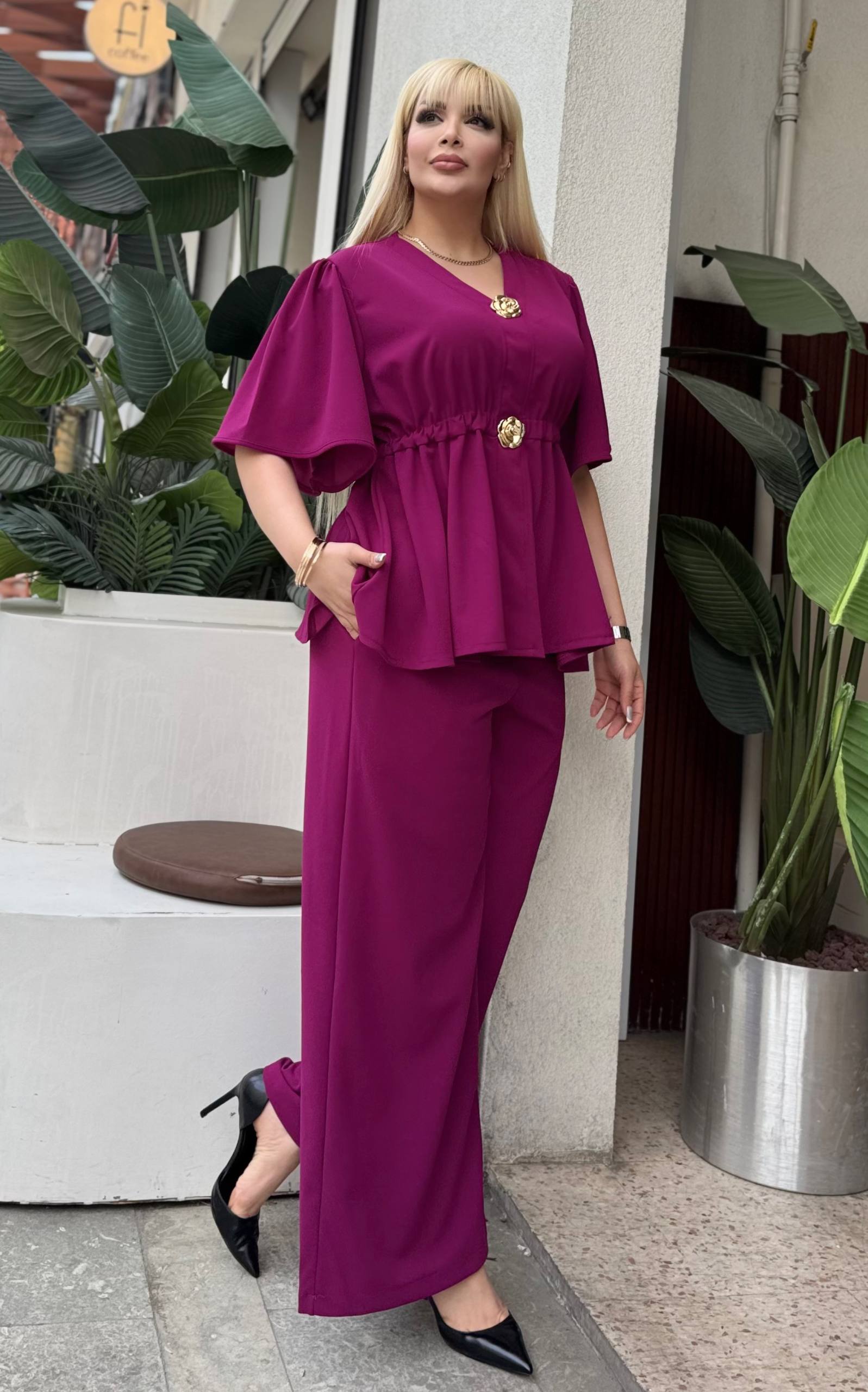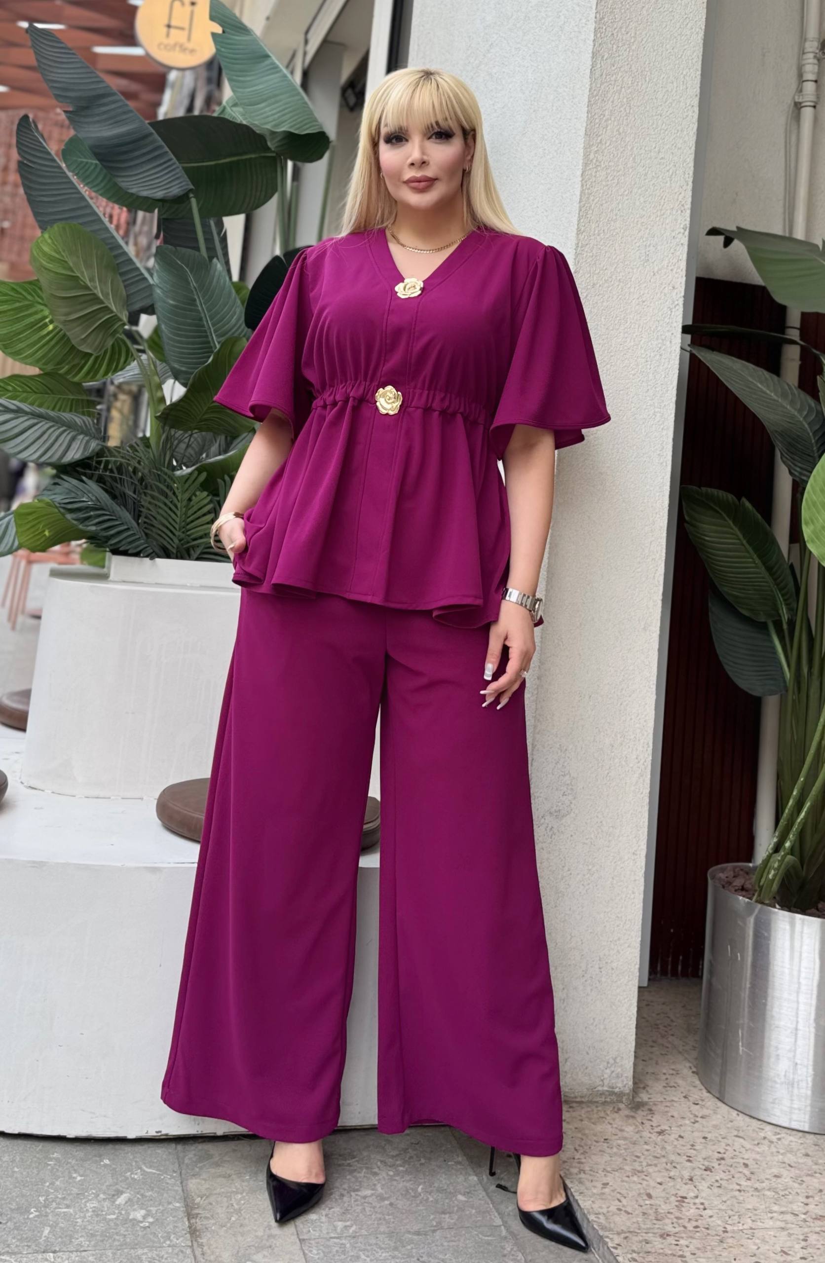 Roze komplet tunika i pantalone, tunika ima detalje u vidu ukrasnih dugmića boje zlata, pantalone su klasicneg ravnog kroja lastiš u struk, praktičan model koji možete nositi u svim prilikama.