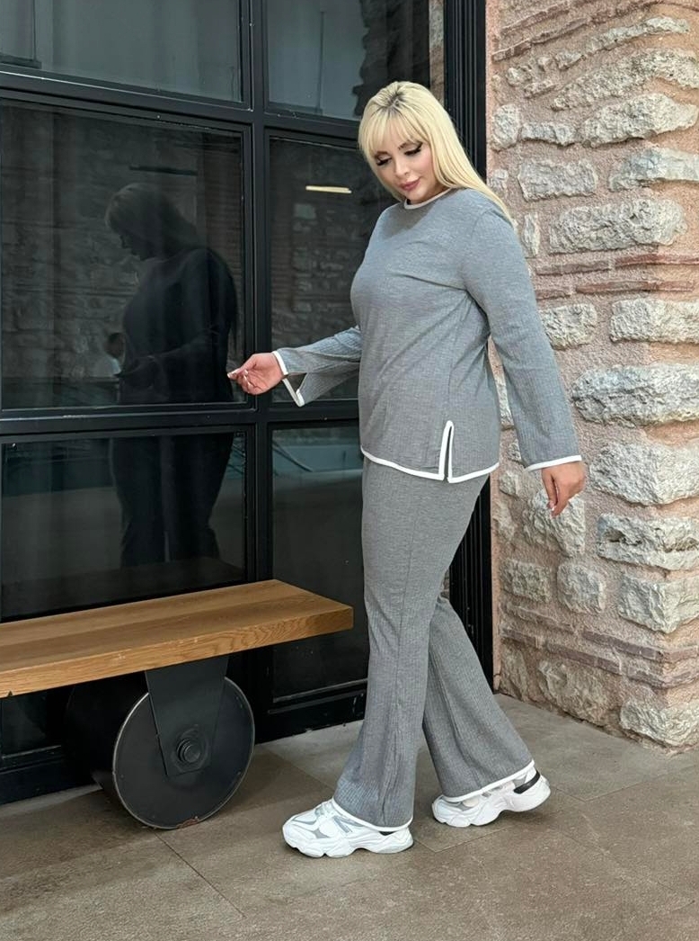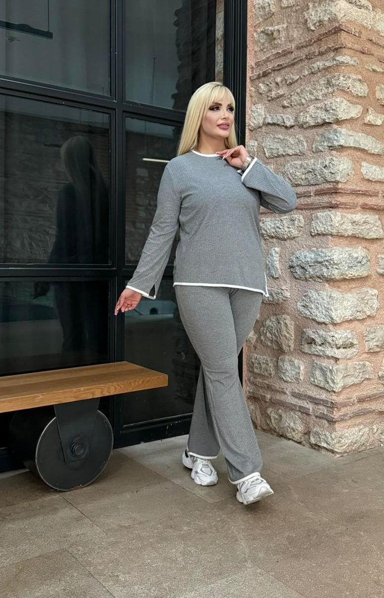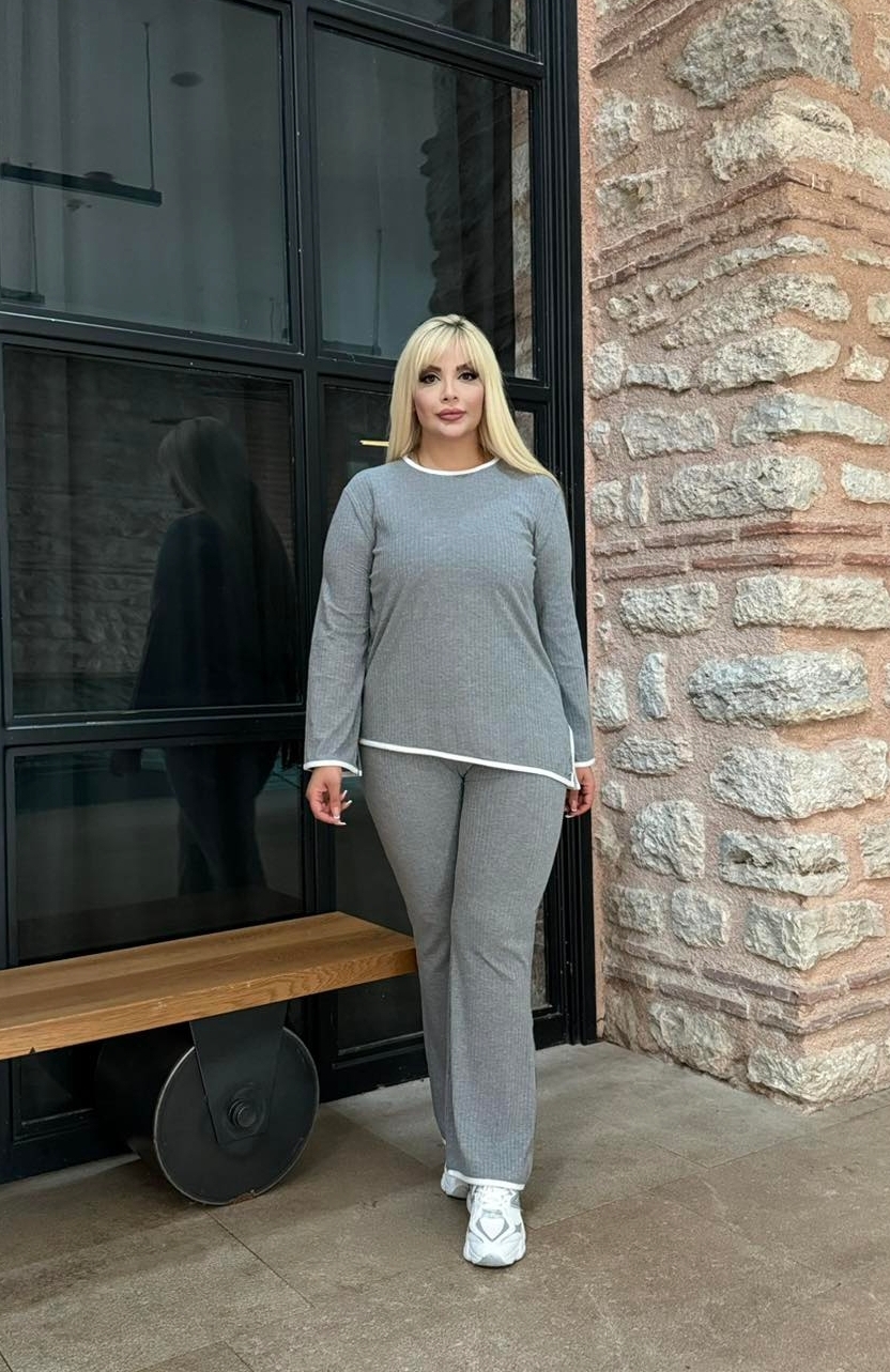 Komplet trenerka sive boje sa belim paspulom, idealna za svakodnevne aktivnosti za sve dame koje vole sportski stil.