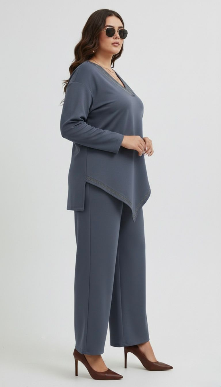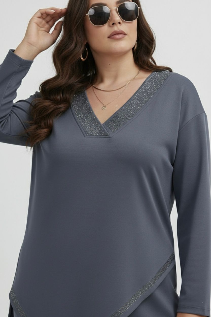 Siva komplet trenerka sa sitnim diskretnim cirkonima u gornjem delu na tunici, donji deo je sa ravnim nogavicama lastiš je u struku, odličan model za sve dame koje vole ležeran stil.