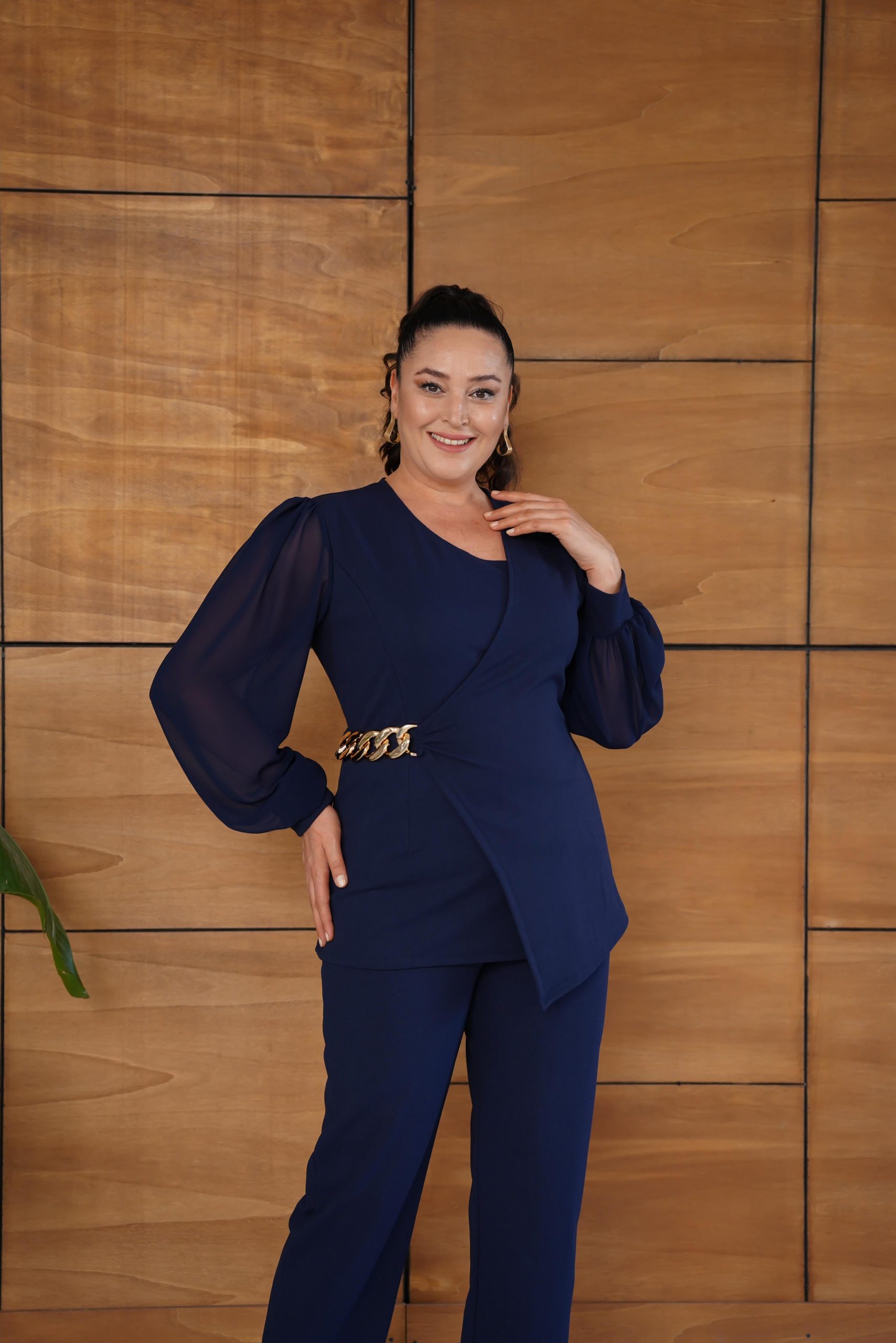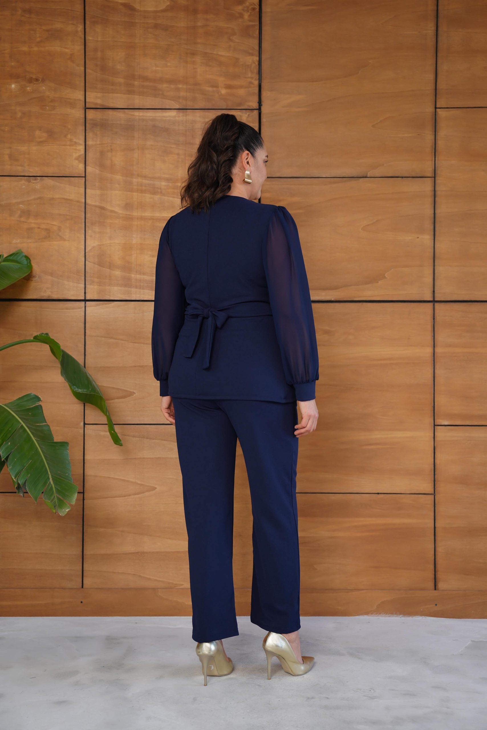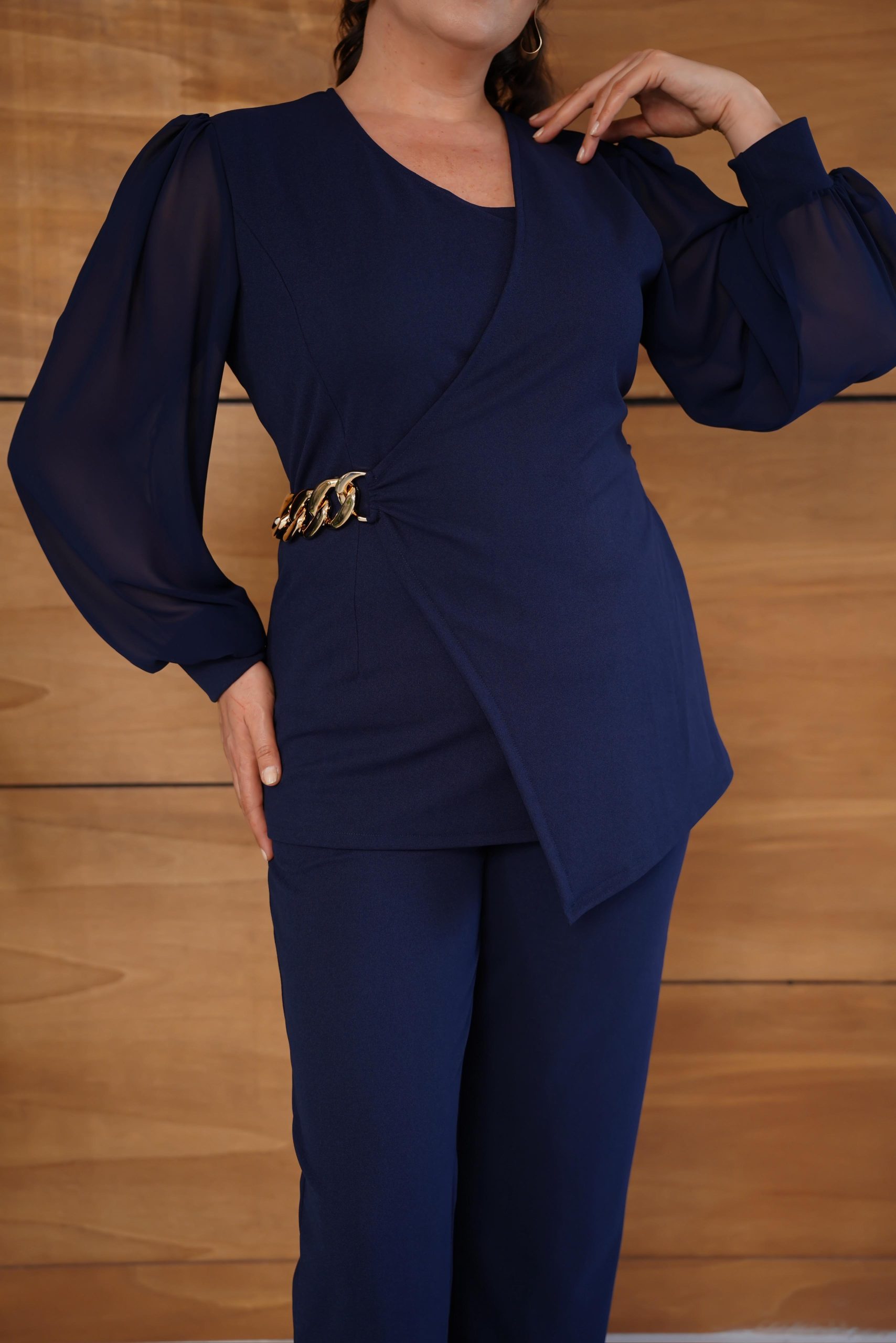 Elegantan teget svečani komplet tunika i pantalone, tunika ima ukrasnu šnalu boje zlata sa strane i providne rukave od tila, pantalone su klasicnog ravnog kroja lastiš u struku, komplet koji možete nositi kako za posao tako i za neke svečanije prilike.