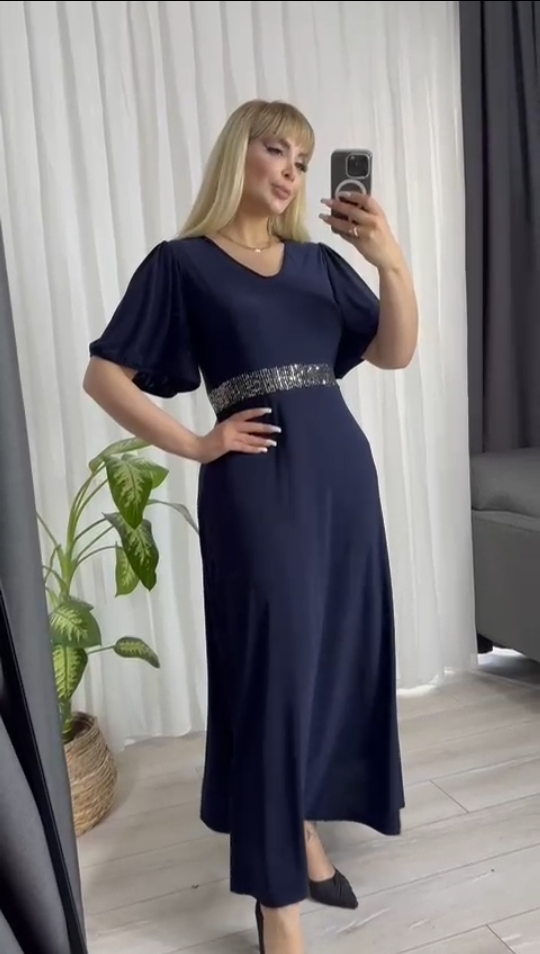 Duga haljina teget boje kroja koji se blago širi, lagana i prijatna za nošenje, ucinice vas izgled elegantnim.