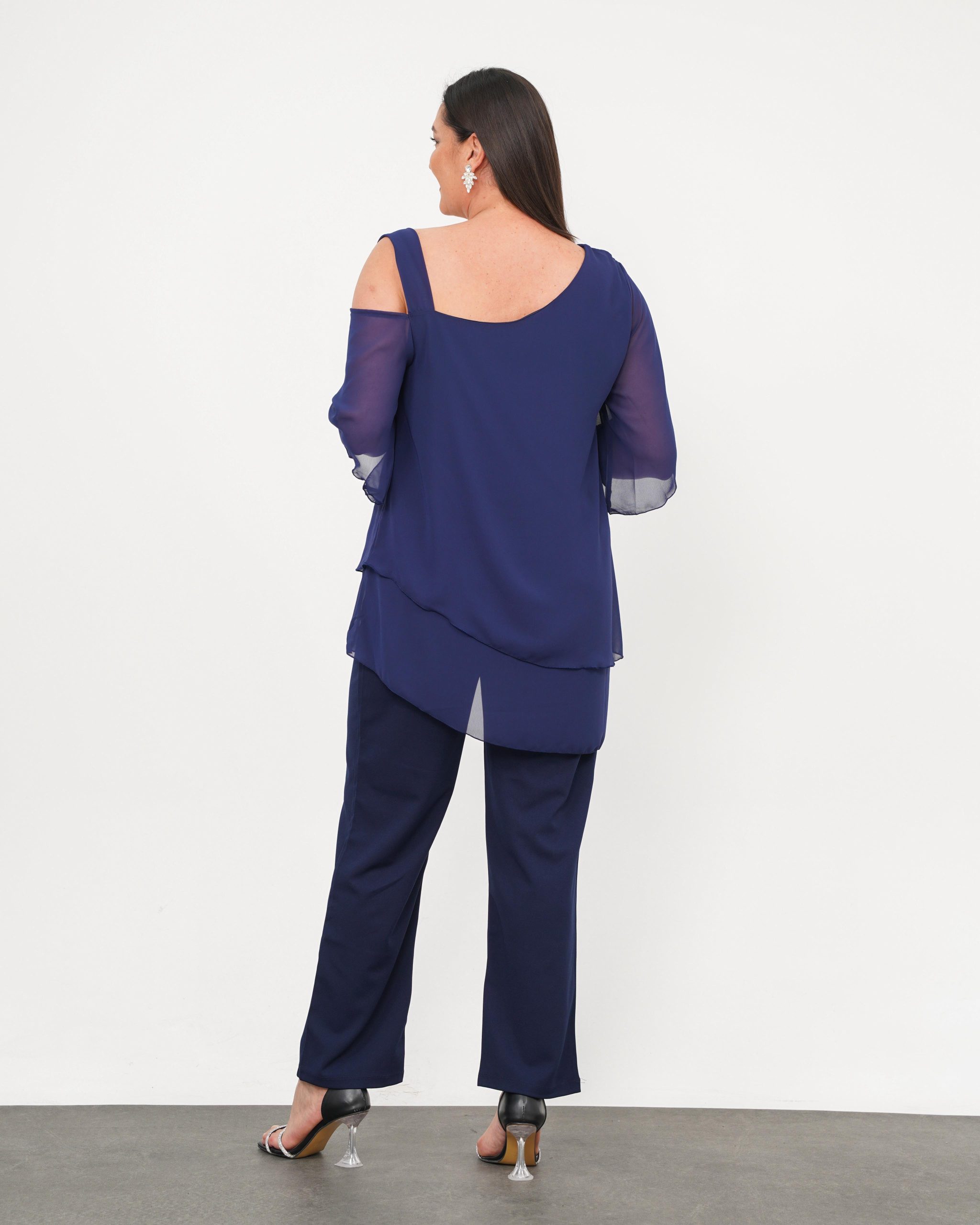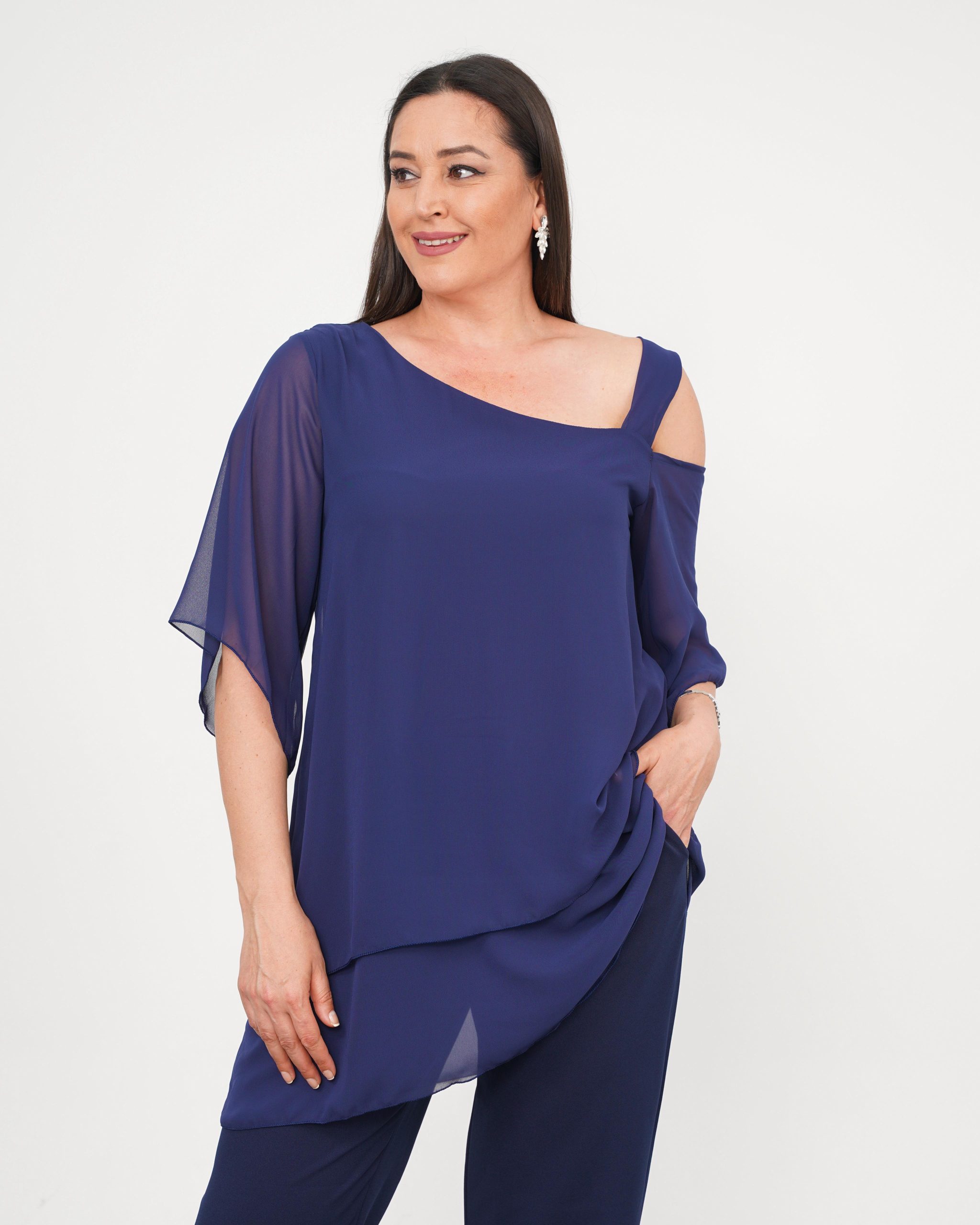 Teget komplet tunika i pantalone, tunika je lepršava sa tilom, pantalone su klasicneg ravnog kroja lastiš u struku, za elegantan i sofisticiran izgled.