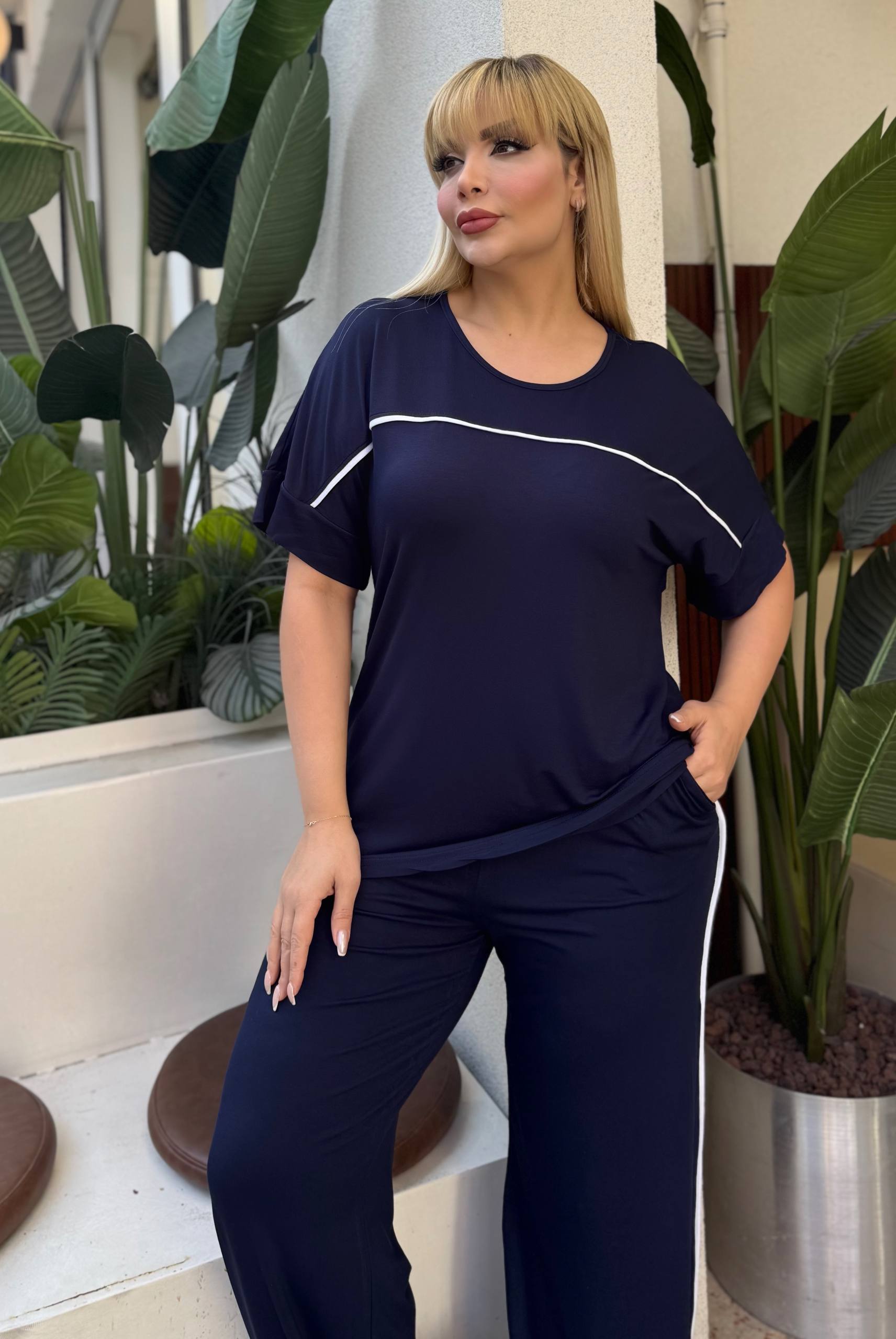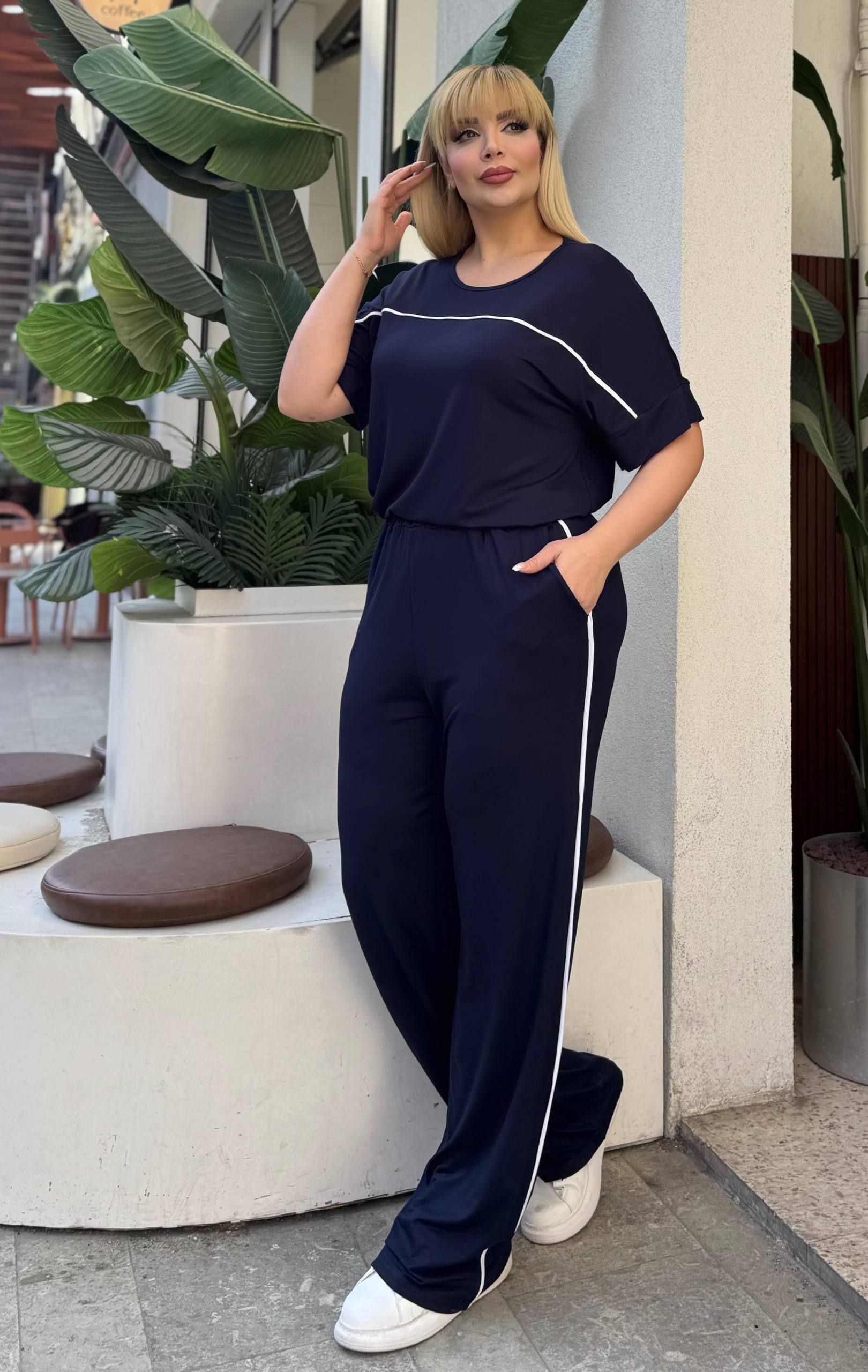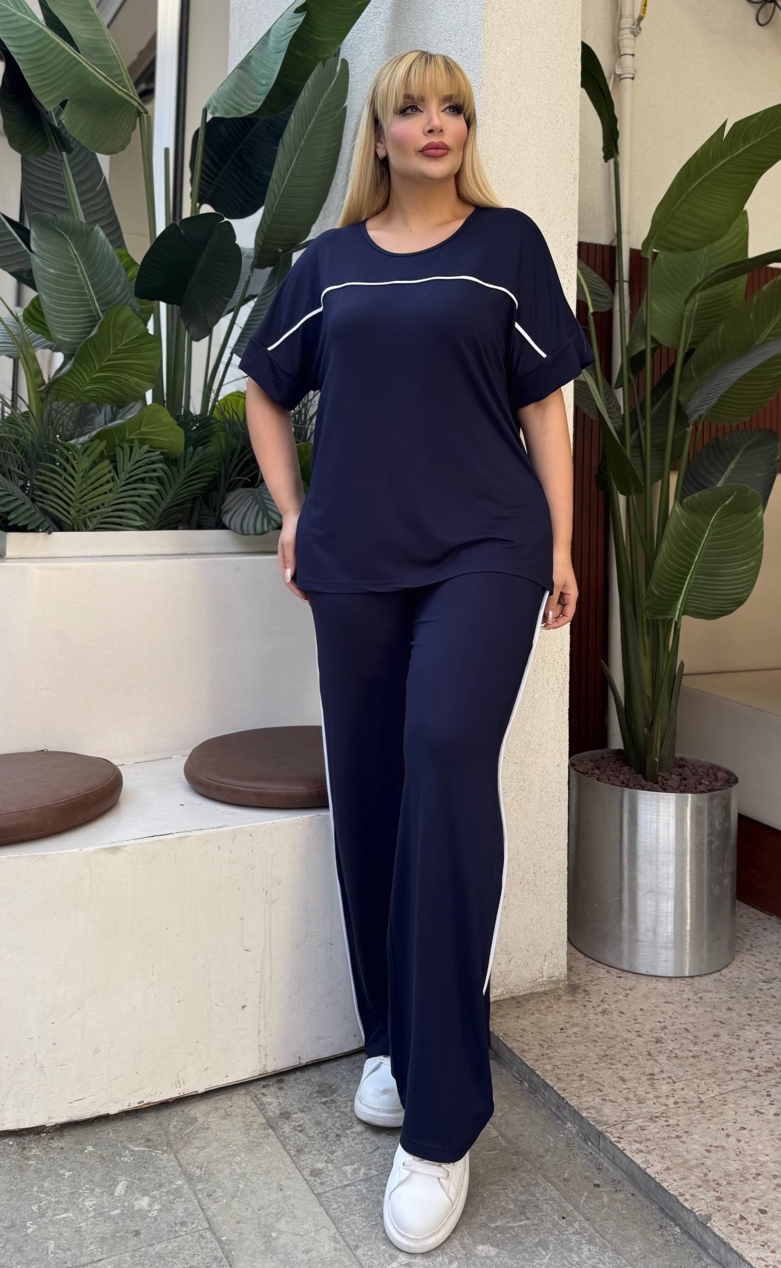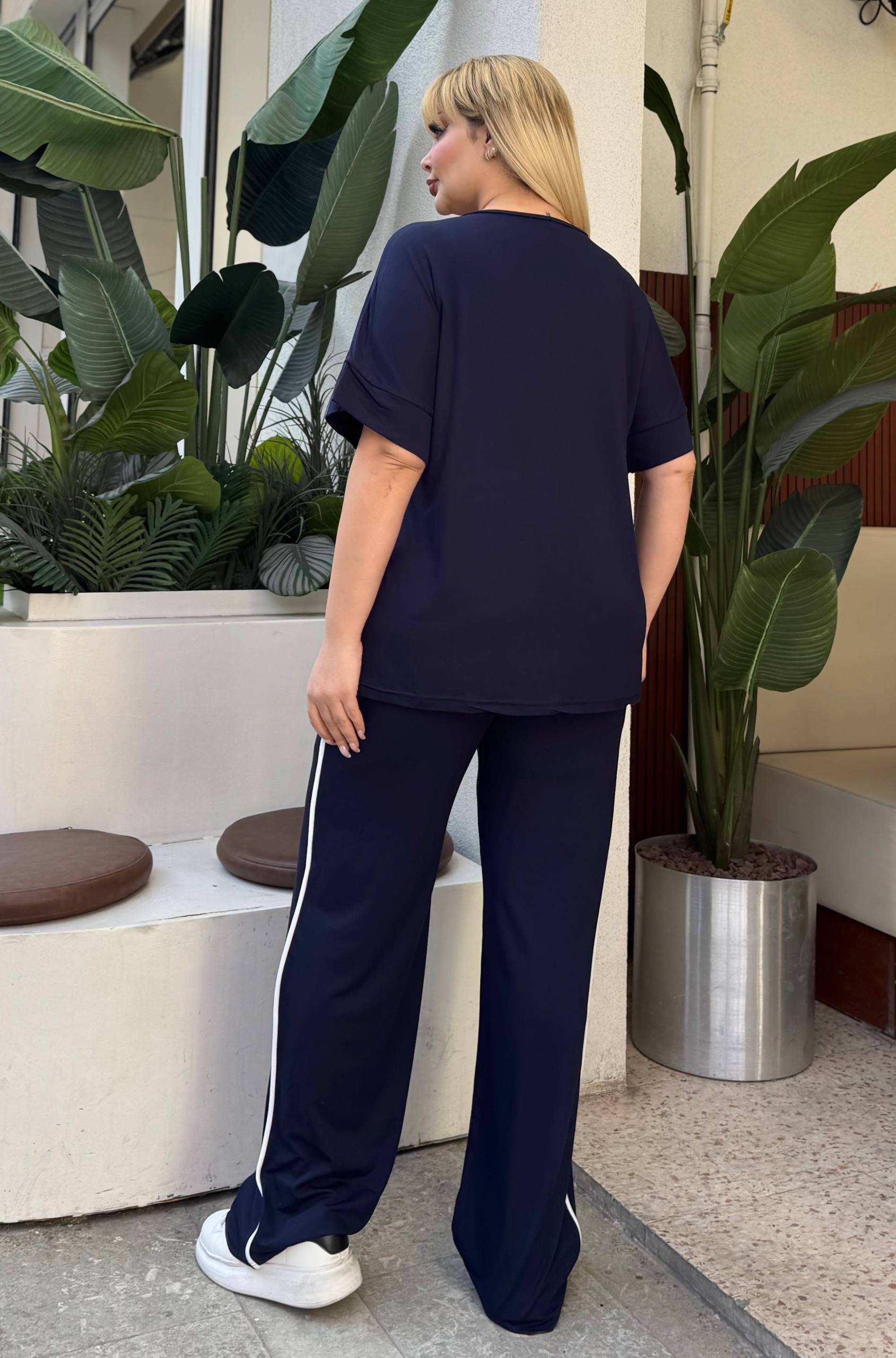 Komplet trenerka u teget boji sa belim linijama, odličan izbor za sve one koje vole udobnost i ležeran stil.