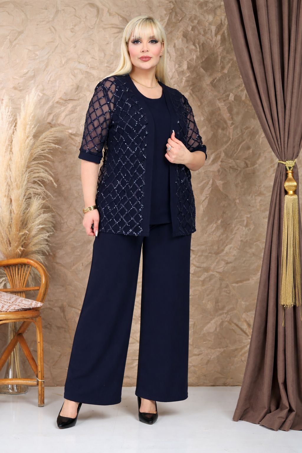 Trodelni komplet koji se sastoji od majice, pantalona i kardigana sa šljokicama. Pantalone su rastegljive u struku i ravnog kroja, pa su udobne za nošenje tokom celog dana. Materijal je prijatan i lepo pada, a ceo komplet može da se nosi zajedno ili da se kombinuje odvojeno za različite prilike.