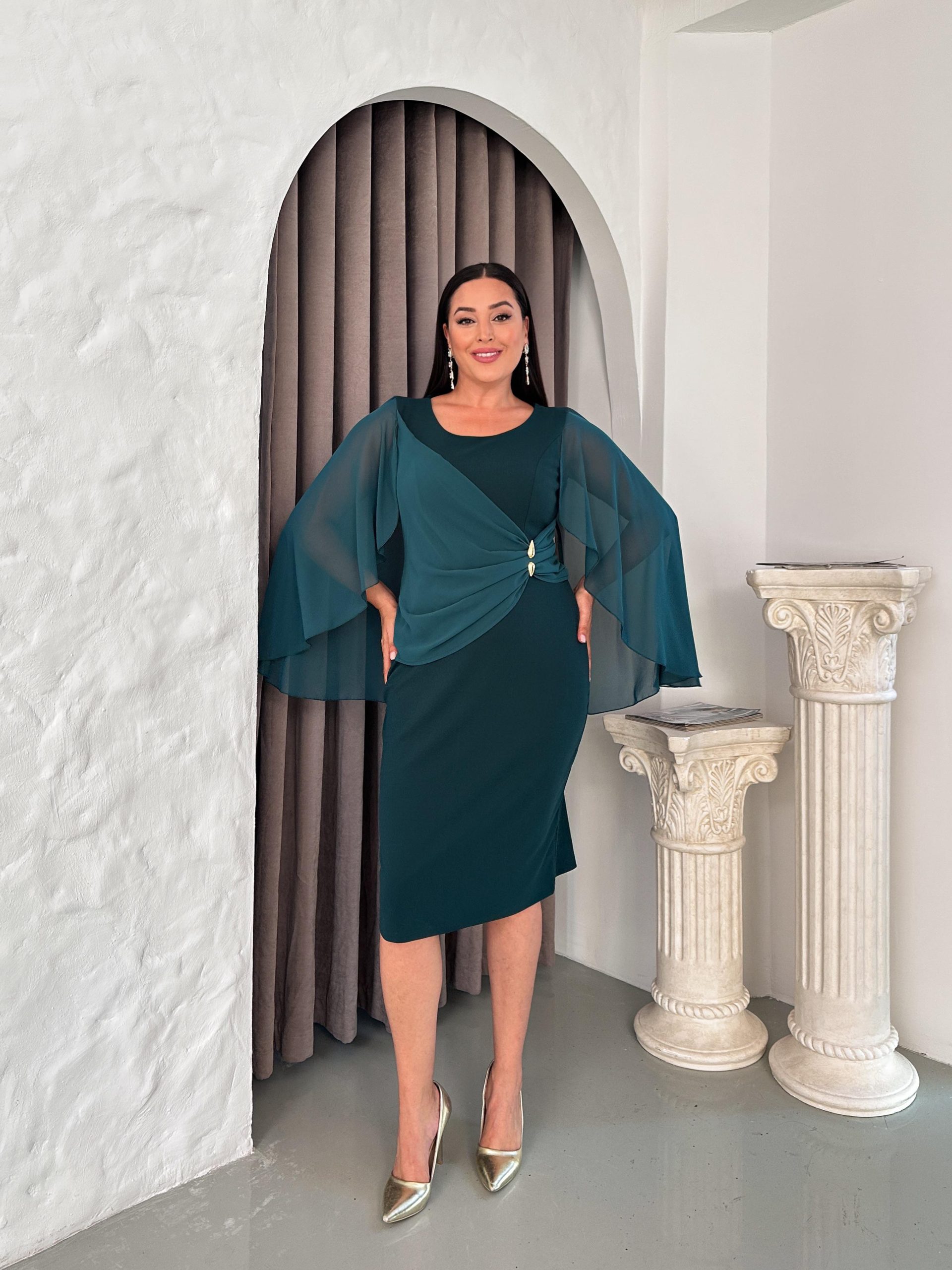 Zelena haljina sa tilom koji ide preko ramena i ukrasnom šnalom u struku, kroj prati liniju tela, idealna za sve svečane prilike.