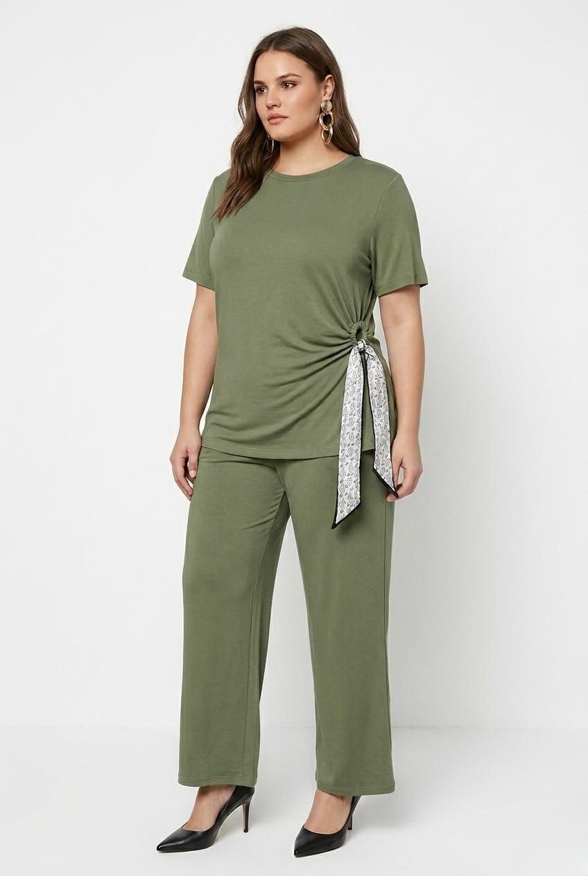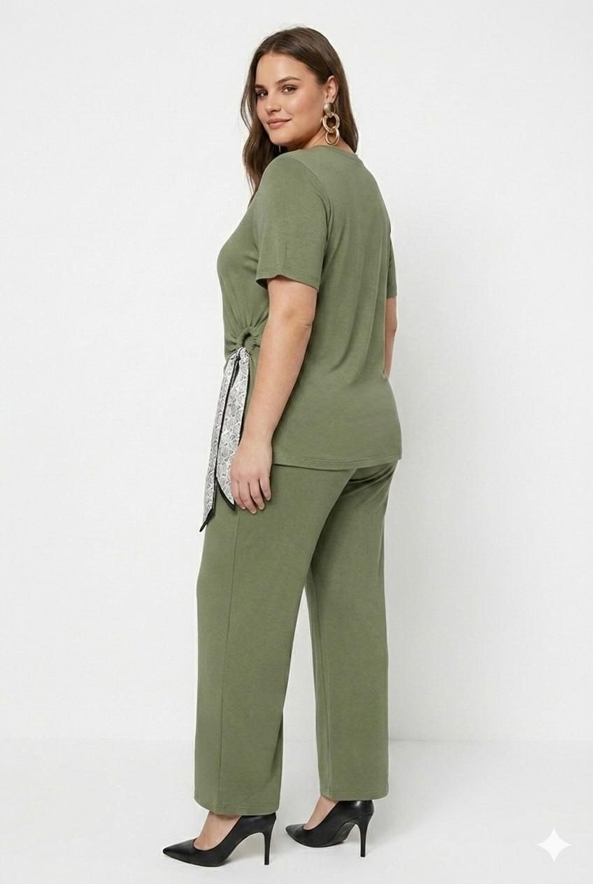 Komplet u zelenoj boji, gornji deo je tunika koja ima detalj u struku u vidu marame, donji deo ima lastiš u struku i nogavice su ravnog kroja. Fantastičan model za sve dame koje vole udobnost a ujedno i efektan izgled.